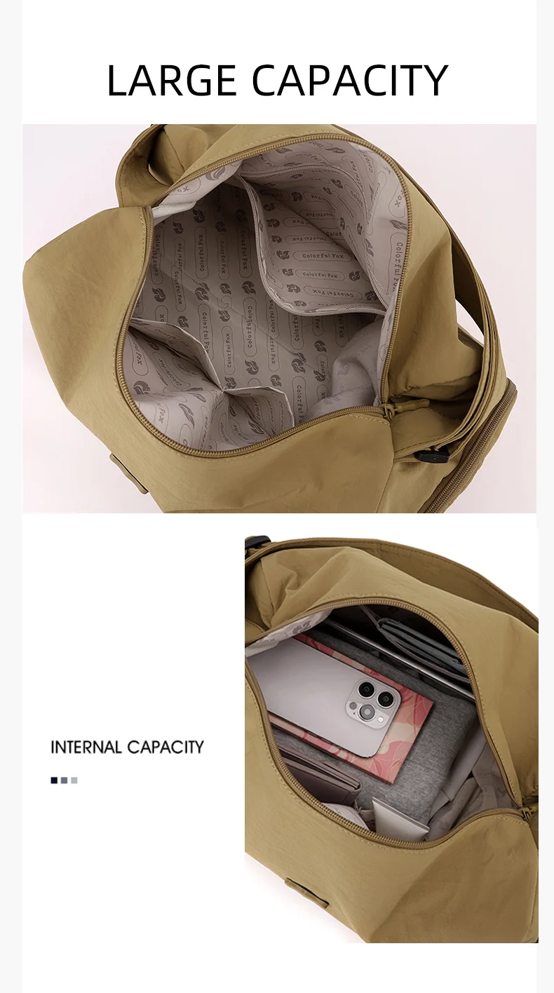 1.Configuración de bolsa principal de gran capacidad, bolsillo con cremallera incorporado y bolsillo de inserción, el cuerpo de la bolsa configura un bolsillo con cremallera, acceso al conveniente
