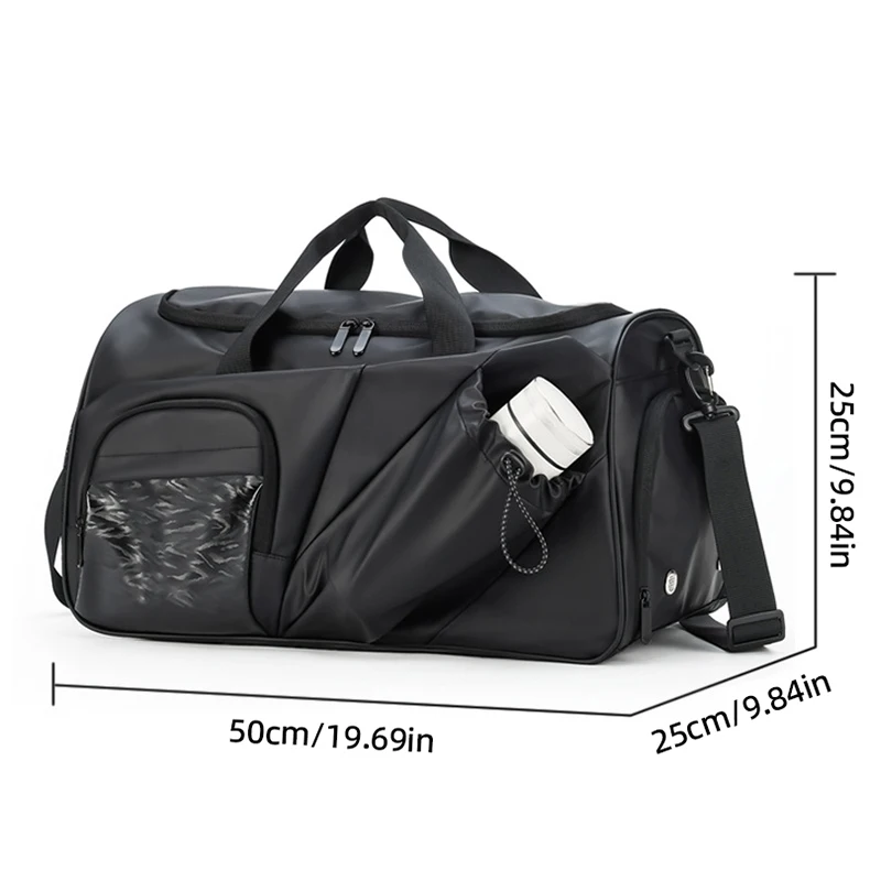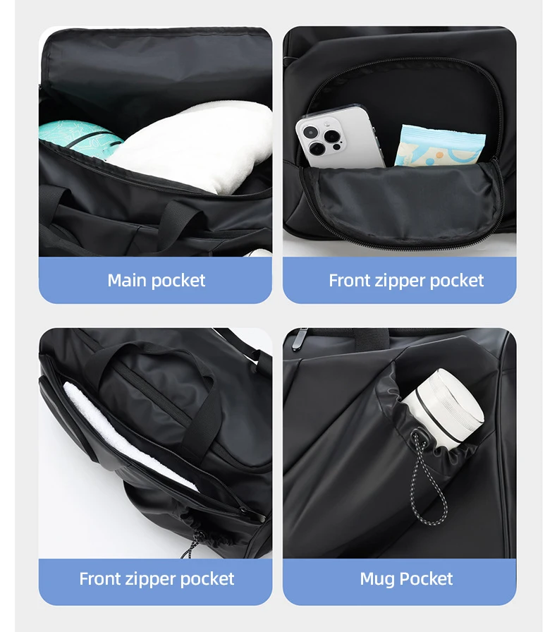 1.Configuración de bolsillo principal de gran capacidad, bolsillo separador húmedo/seco incorporado, bolsillos laterales de malla que se instalan en el cuerpo de la bolsa, múltiples bolsillos secundarios con cremallera, compartimento separado para zapatos y bolsillo para insertar botella de agua.Almacenamiento de partición, fácil acceso
