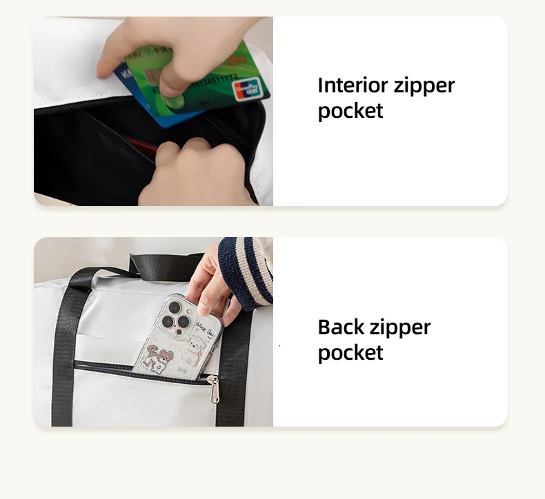 1.Configuración de bolsa principal de gran capacidad, bolsa con cremallera incorporada, bolsillo con cremallera en la parte posterior del cuerpo de la bolsa, fácil acceso