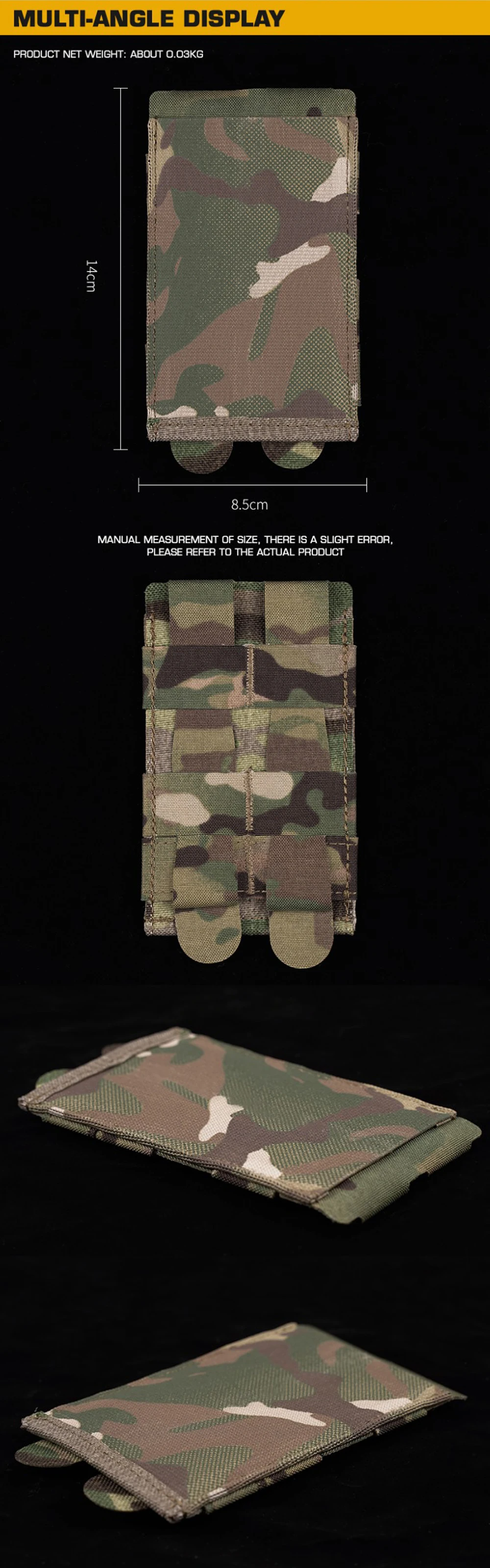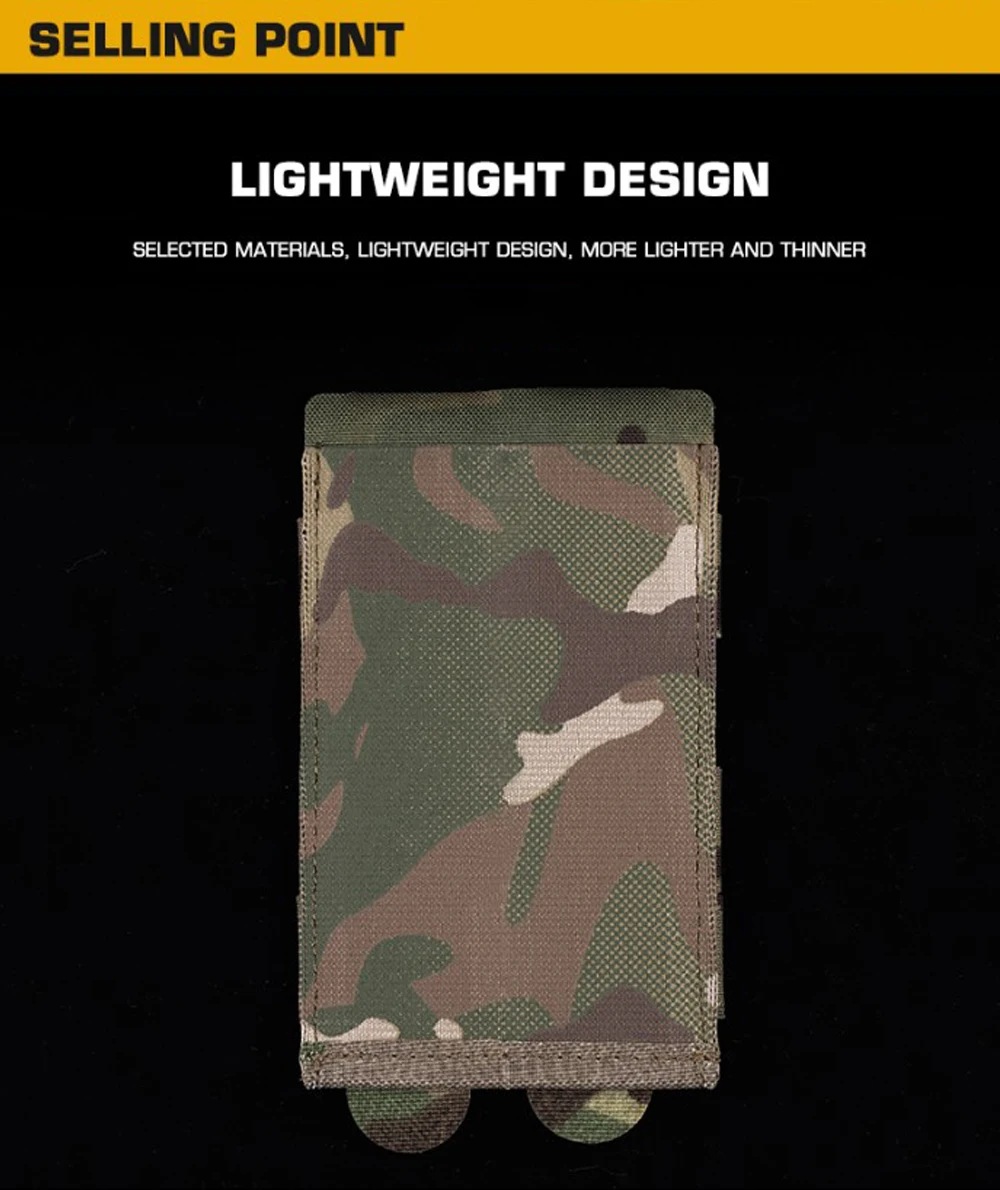 Nombre del producto: bolsa magnética elástica ligera Número de artículo.:MG-114 Embalaje del producto: bolsa empaquetada Tamaño del producto: 14*9*1cm Peso neto del producto: 0,03 kg. Color del producto: negro mate/Multicam/Multicam Black/marrón coyote/verde Ranger/gris lobo Material principal: Cordura, banda elástica.