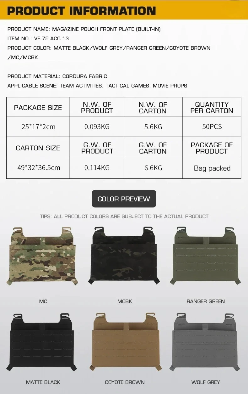 Placa frontal con bolsa Mag incorporada MOLLE adaptada al portaplacas con cinta mágica, accesorios de caza