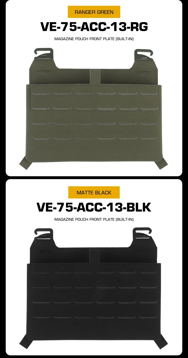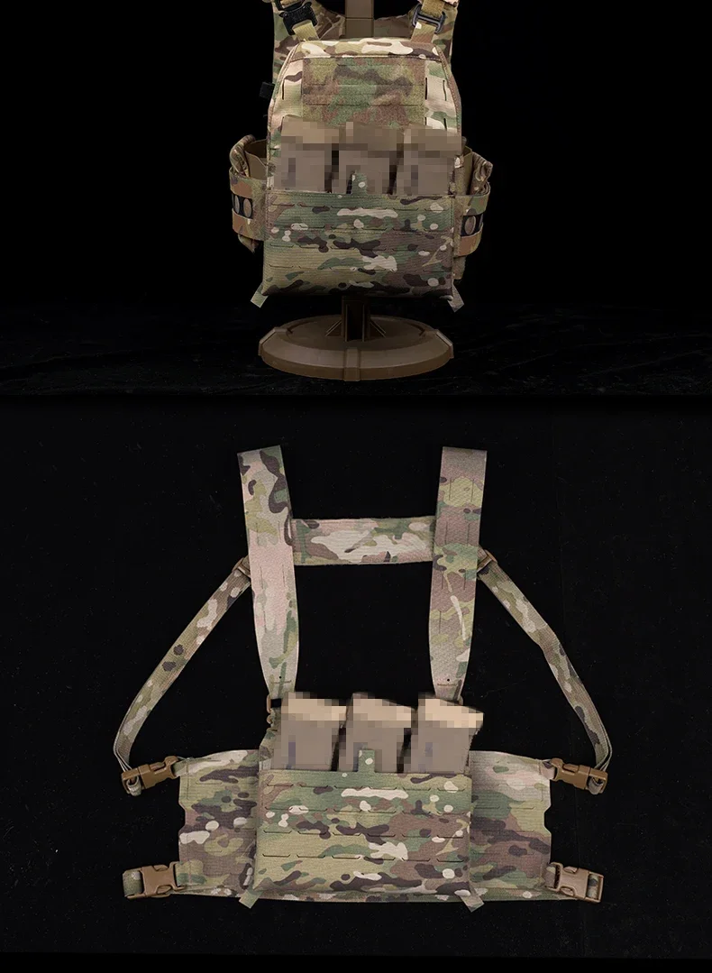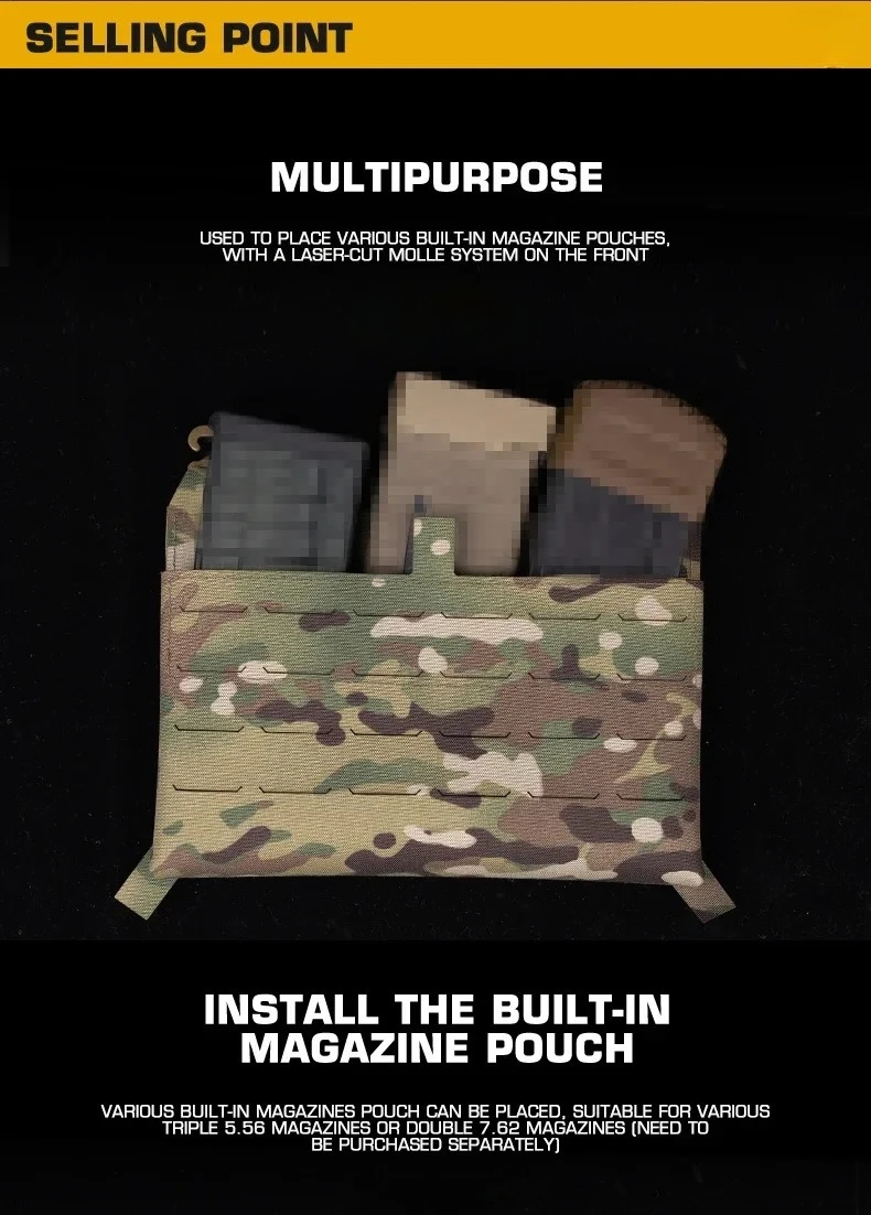 1. Este producto cuenta con un sistema MOLLE cortado con láser en la parte frontal y un bucle en el interior para colocar cómodamente varias bolsas para cargadores incorporadas.