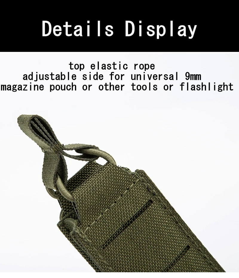 No es solo un excelente cargador de pistola, sino también una buena ayuda para su EDC.Además de sostener cargadores de pistola de 9 mm, también puede ser compatible con artículos pequeños como linternas y herramientas multiusos, lo que le permite transportar fácilmente el equipo necesario en escenarios como caza, aventuras al aire libre y entrenamiento táctico, con un acceso conveniente que no No retrasar cosas.