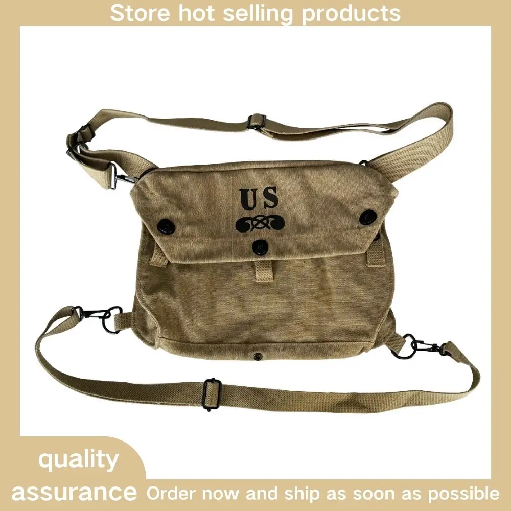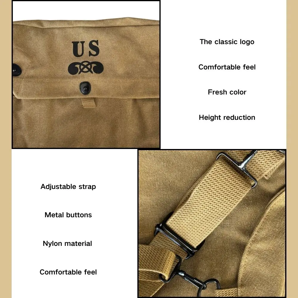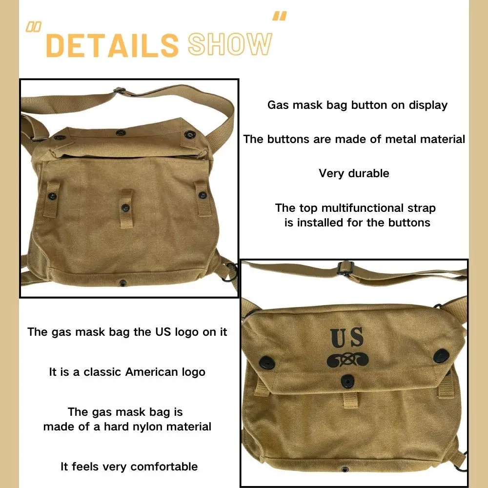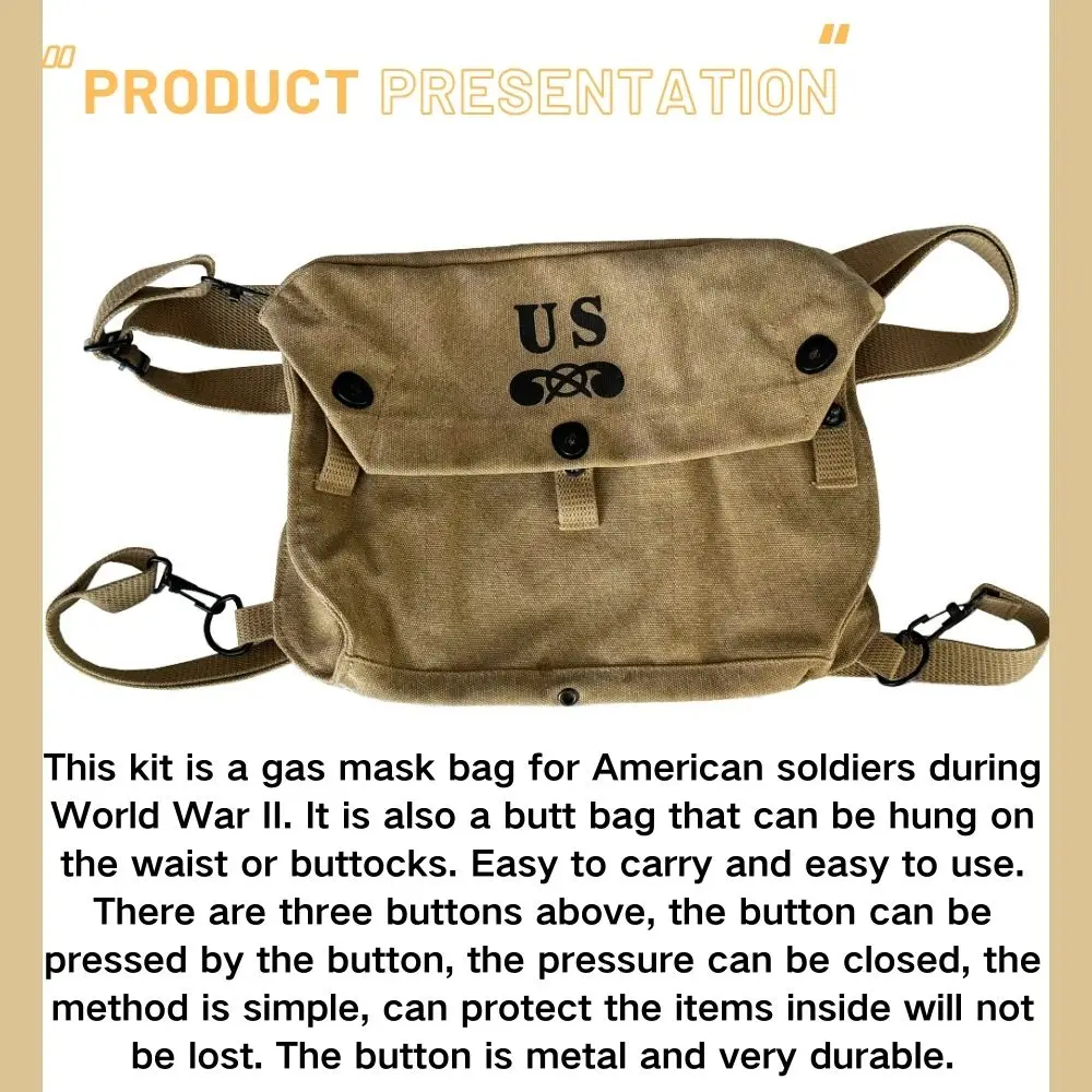 Este kit es una bolsa para máscara de gas para soldados estadounidenses durante la Segunda Guerra Mundial. También es un bolso trasero que se puede colgar en la cintura o en las nalgas. Fácil de transportar y fácil de usar. Hay tres botones arriba, el botón se puede presionar con el botón, la presión se puede cerrar, el método es simple, puede proteger los artículos en el interior y no se perderá. El botón es de metal y muy duradero. La correa sobre la bolsa americana para máscara de gas es extraíble y la hebilla de metal arriba es el punto de desmontaje. El botón de una correa es ajustable, ajustando la longitud de la correa para el hombro de la máscara de gas, y puedes ajustarla a tu posición favorita.
