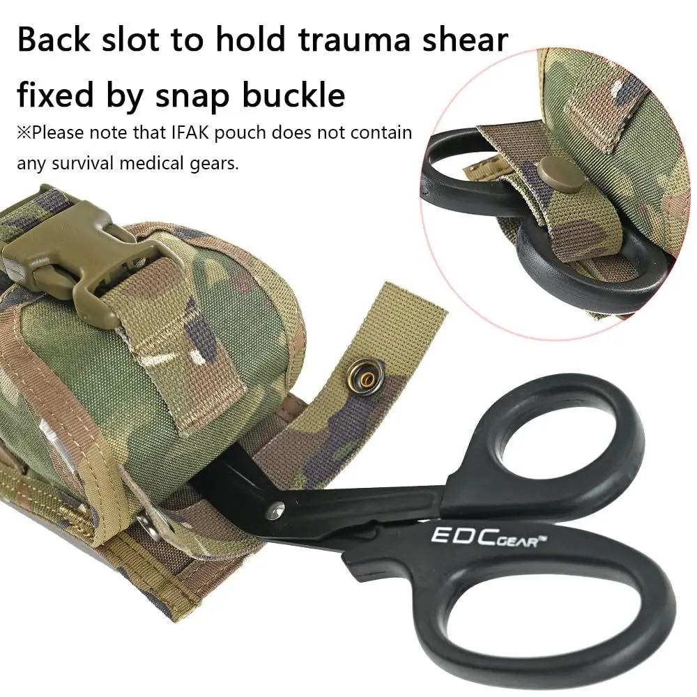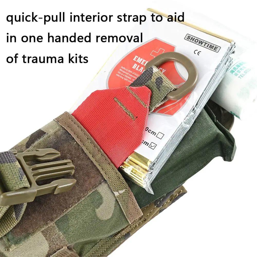 La bolsa de IFAK consiste en 1 Departamento Principal y 1 Departamento administrativo. La correa interior de extracción rápida de la bolsa de primeros auxilios molle ayuda en la eliminación de kits de trauma con una mano. Y la parte superior del Departamento de Administración está integrada en una correa de cincha con hebilla a presión para sujetar la cizalla de Trauma