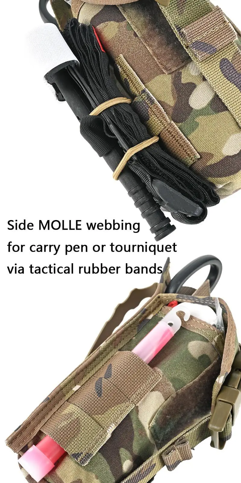 Equipado con dos clips MOLLE, la bolsa médica molle se puede acoplar al chaleco táctico, cinturón de combate, mochila táctica u otras cosas que tengan sistema MOLLE/PALS.