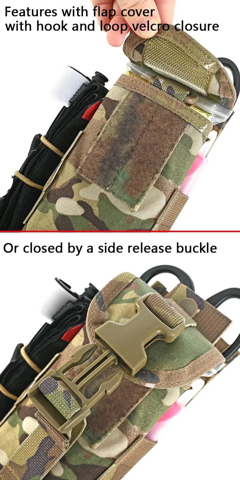 La bolsa del kit de trauma cuenta con una cubierta de solapa que se puede cerrar con una hebilla de Liberación lateral, un gancho y bucle o ambos. Las correas MOLLE en los lados de la bolsa de trauma permiten que la bolsa compacta IFAK sostenga pequeños kits externos y el orificio de drenaje en la parte inferior hace que la bolsa de medicina esté limpia y ordenada