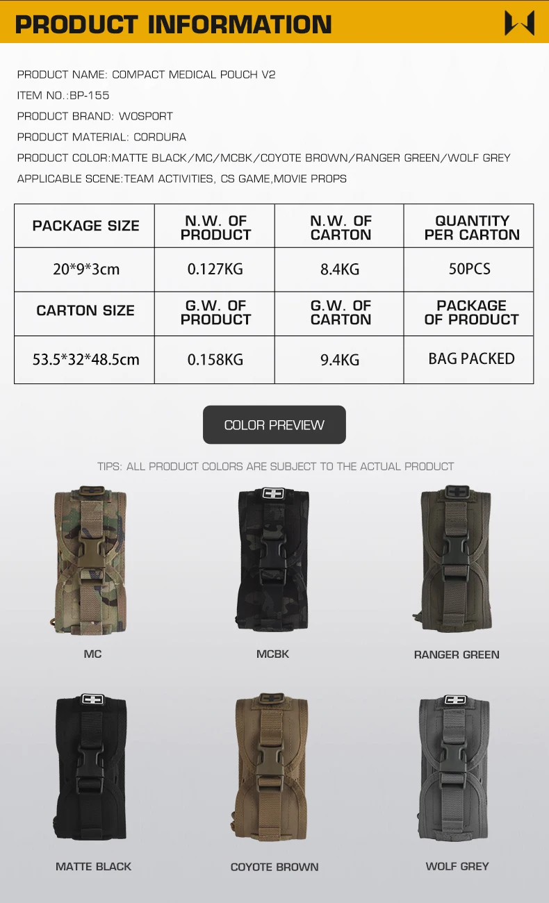 Información del producto: Nombre del producto: Bolsa médica compacta V2 Material del producto: Cordura Color del producto: negro mate/MC/MCBK/marrón coyote/verde Ranger/gris lobo. Escena aplicable: actividades de equipos, juegos CS, accesorios de películas.