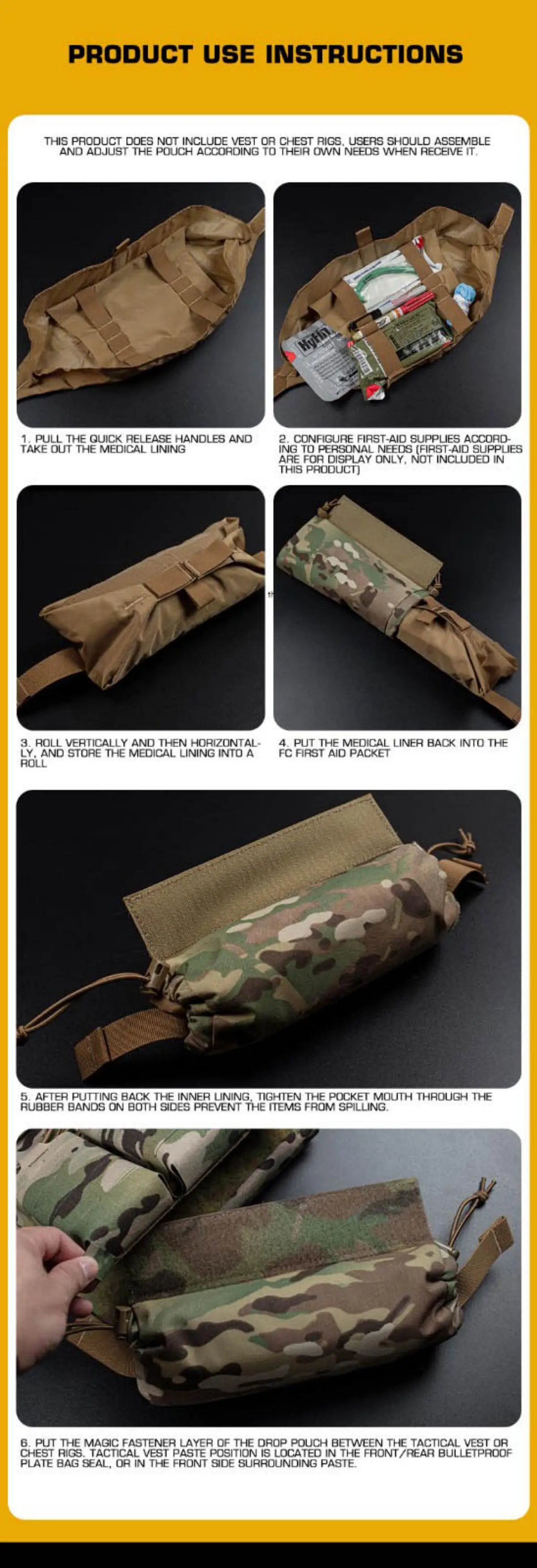 NO incluye ningún material de primeros auxilios, chalecos tácticos ni aparejos para el pecho.Todos los artículos médicos y los equipos mostrados tienen fines de demostración.
