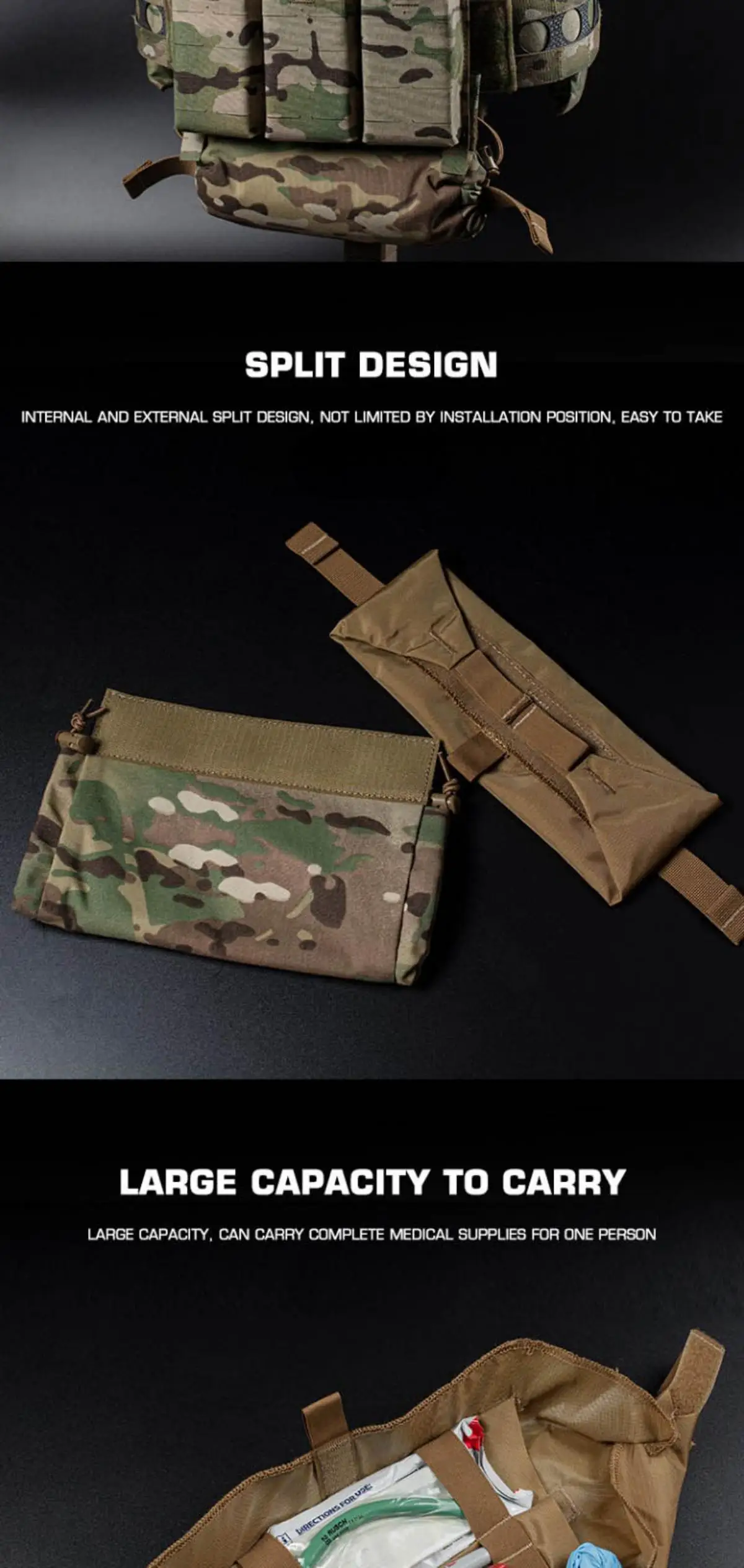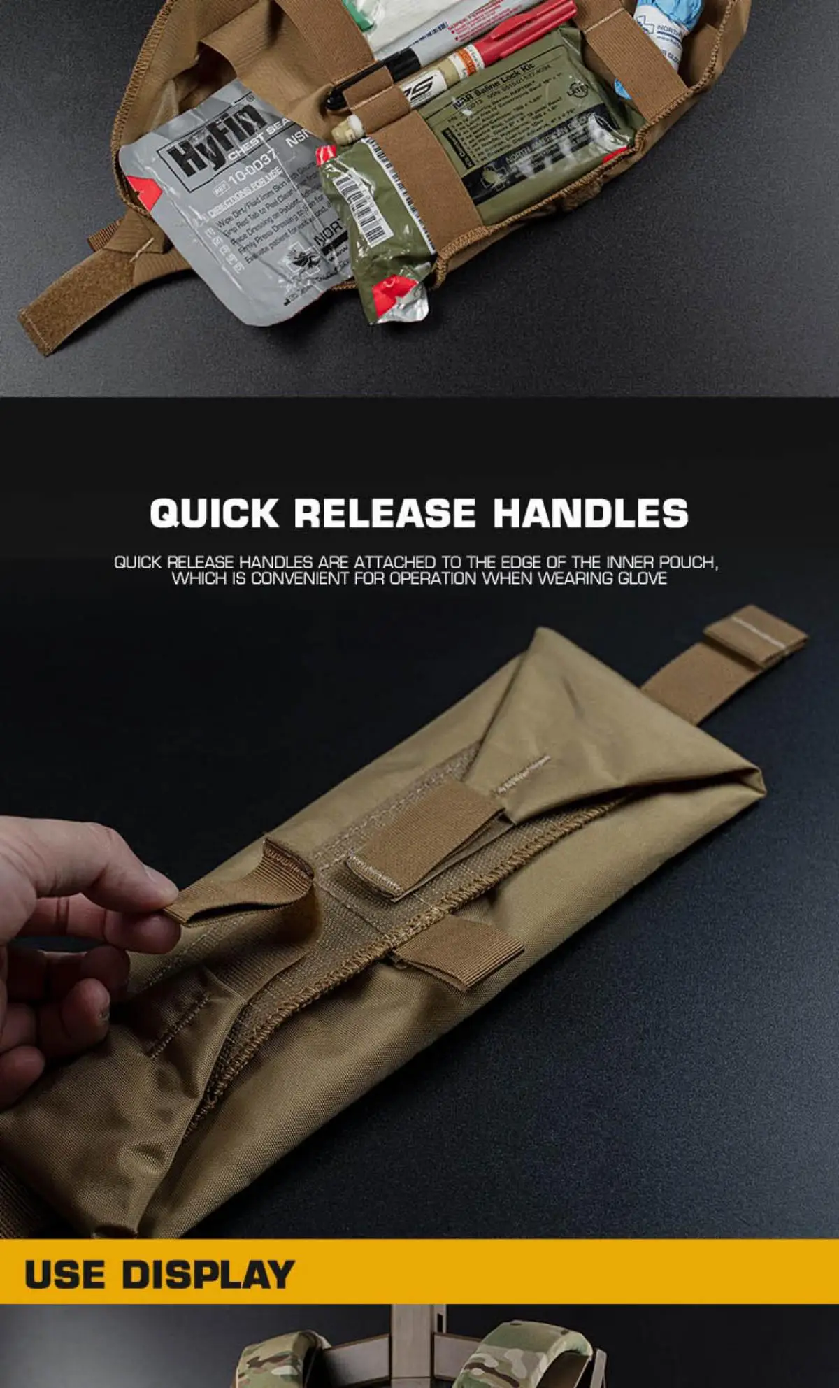 Acceso rápido compatible con guantes: el forro interior cuenta con un prominente mango de liberación rápida cosido en su borde.Esto proporciona un punto de agarre positivo, lo que le permite extraer rápidamente todo el núcleo médico con un solo tirón, incluso mientras usa guantes tácticos gruesos, eliminando las molestias en situaciones de alto estrés.