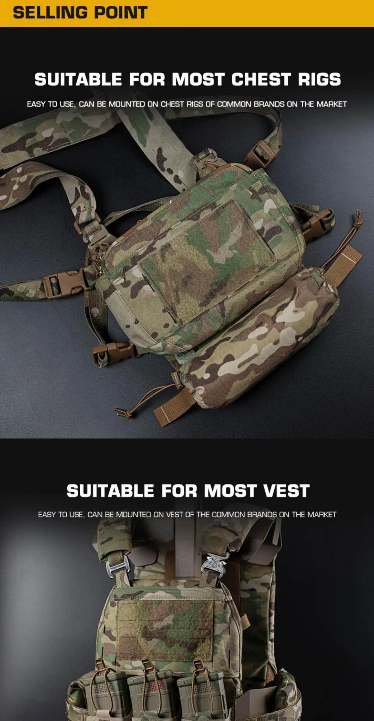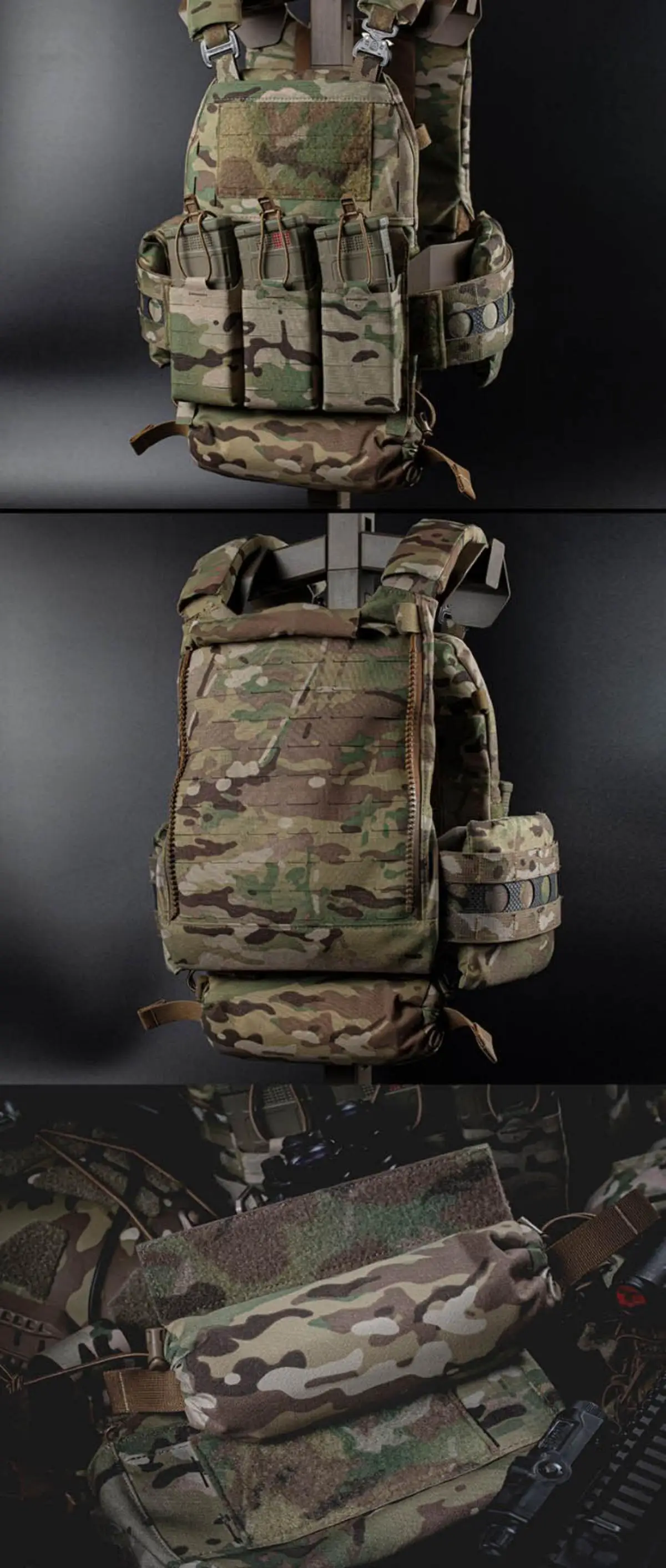 Montaje universal sin herramientas: diseñado para una máxima compatibilidad.La bolsa exterior tiene una gran capa de velcro (gancho y bucle) en su parte posterior.Esto permite que sea intercalado de forma segura entre las capas de la mayoría de los chalecos tácticos o aparejos de pecho del mercado (por ejemplo, entre los sellos de la bolsa con placa antibalas delantera y trasera, o en el fajín delantero), sin necesidad de correas MOLLE.(Adecuado para las marcas más comunes).