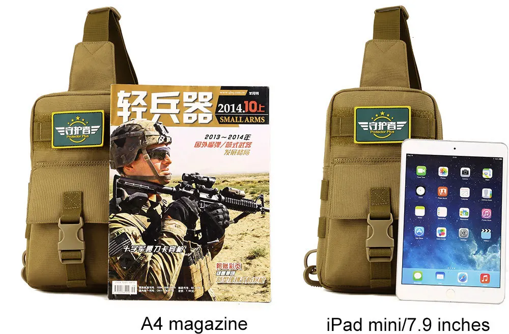 Marca: PROTECTOR PLUS Nombre: bandolera táctica Número de modelo: X217 Dimensiones: 26*16*9cm Material: nailon antidesgarro Forro: tela de revestimiento impermeable Color: CB/BK/JD/ACU/DD Peso: 0,35 kg Volumen: se puede colocar el iPad mini (tablet PC de 7,9 pulgadas) Función: bandolera Adecuado: deporte, senderismo, escalada, ciclismo