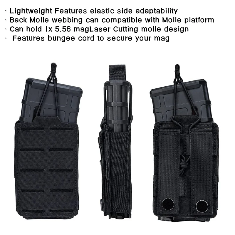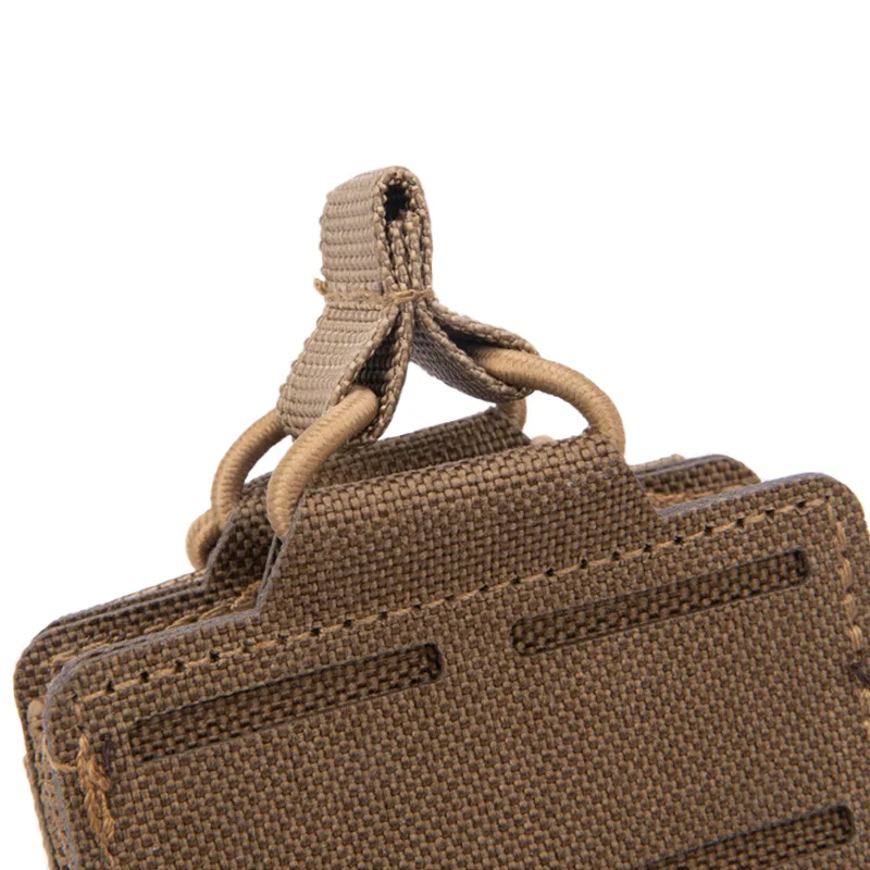 FÁCIL ACCESO: Bolsa para cargador con tapa abierta y diseño de tiradores elásticos ajustables.Los tiradores elásticos pueden fijar eficazmente el cargador cuando combate.