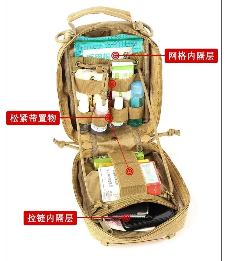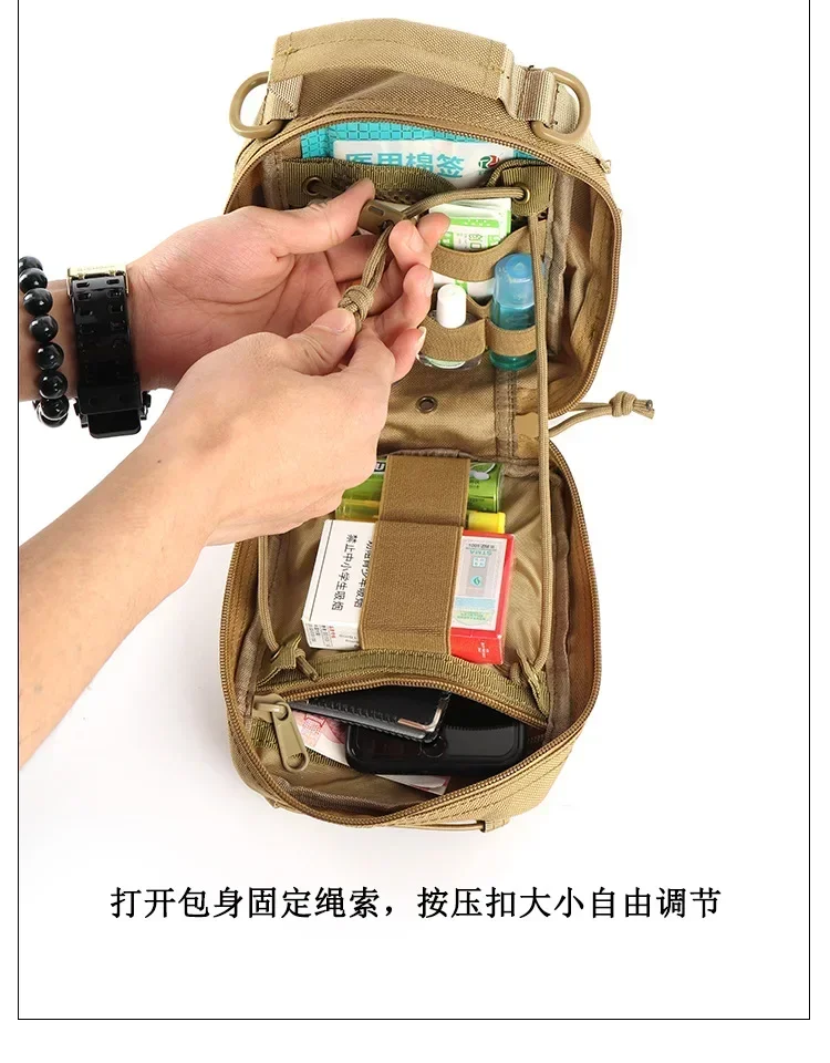 Features: 1.Made of 1000D high quality nylon material. 2.With two-way smooth silent zipper.It is convenient to take and put the items 3.With 3 new design position on the front of the pouch, which can store pens, flashlight and other cylindrical tools 4.The grid design is adopted inside, which can clearly see the stored products and is convenient to take 5.There are many webbing positions on both sides of the bag,which can hang small objects 6.Molle system design on the back.It can be attached to backpack, vest, belt and other molle gears 7.There is a drawstring inside for quick close of the bag.