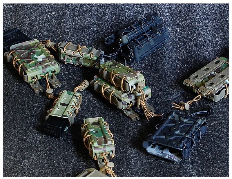 Se adapta a revistas 9mm/45ACP 5,56 7,62 El cuerpo de polímero flexible y el soporte están unidos con cuerda elástica El sistema MOLLE cumple con la mayoría de los PALS estándar La parte superior acampanada facilita la reinserción de los cargadores. Especificación: Material: nailon y TPU Colores disponibles: negro, marrón, verde, CP, gris, BKCP El paquete incluye: Revista con clip Molle