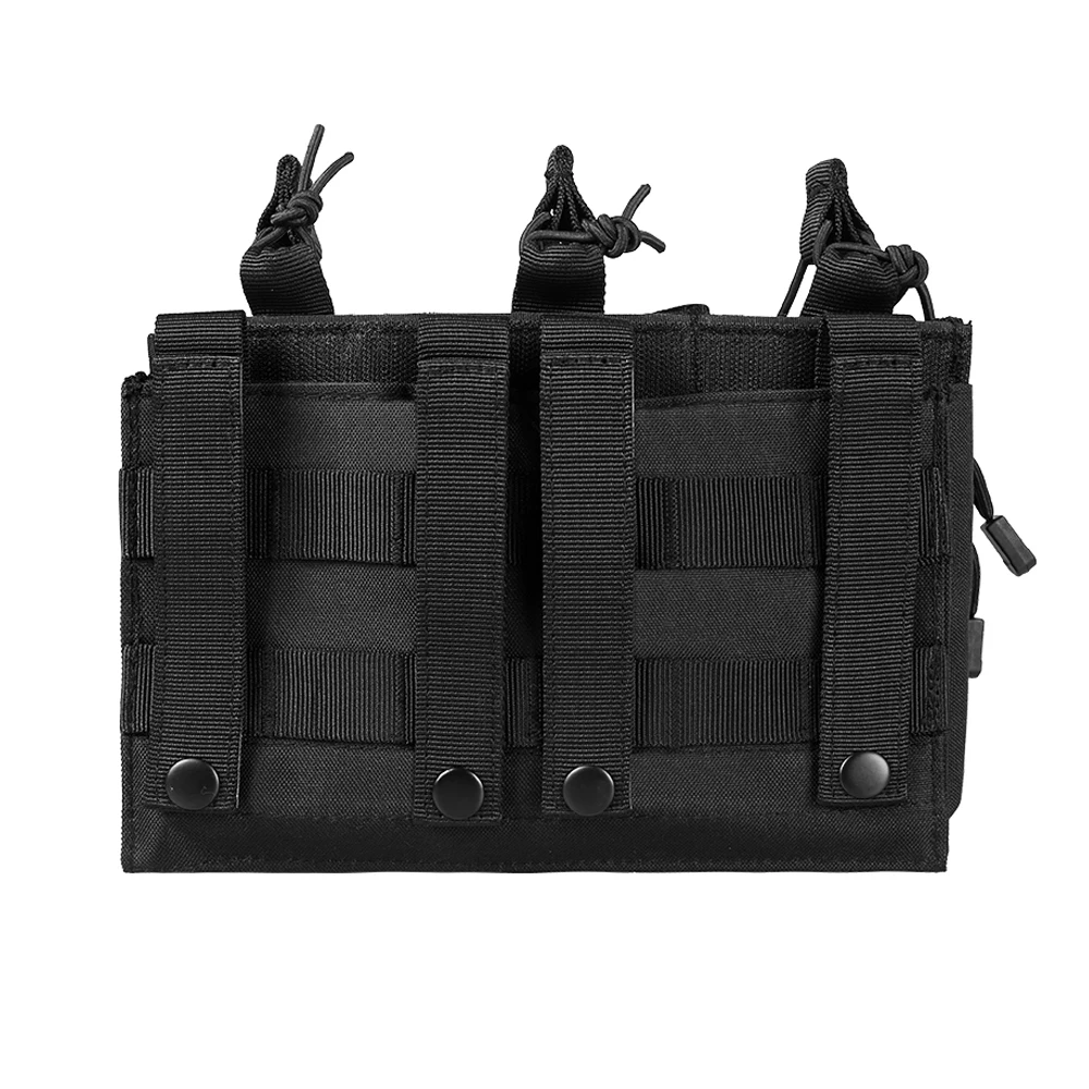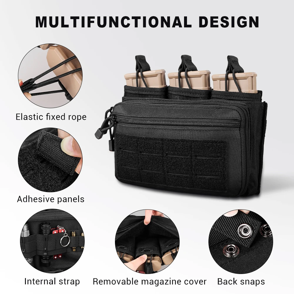 La bolsa para cargadores tiene bolsas para cargadores triples separadas en la parte trasera para contener hasta tres cargadores M4/M16/AR, etc. (cargadores de 5,56 mm) o de tamaño similar.La bolsa Molle adopta un diseño superior abierto para dibujar rápidamente a las revistas.La parte superior de la bolsa para cargadores con retención elástica ajustable para fijar las cargadores, brindando seguridad para las cargadores durante operaciones y actividades al aire libre.