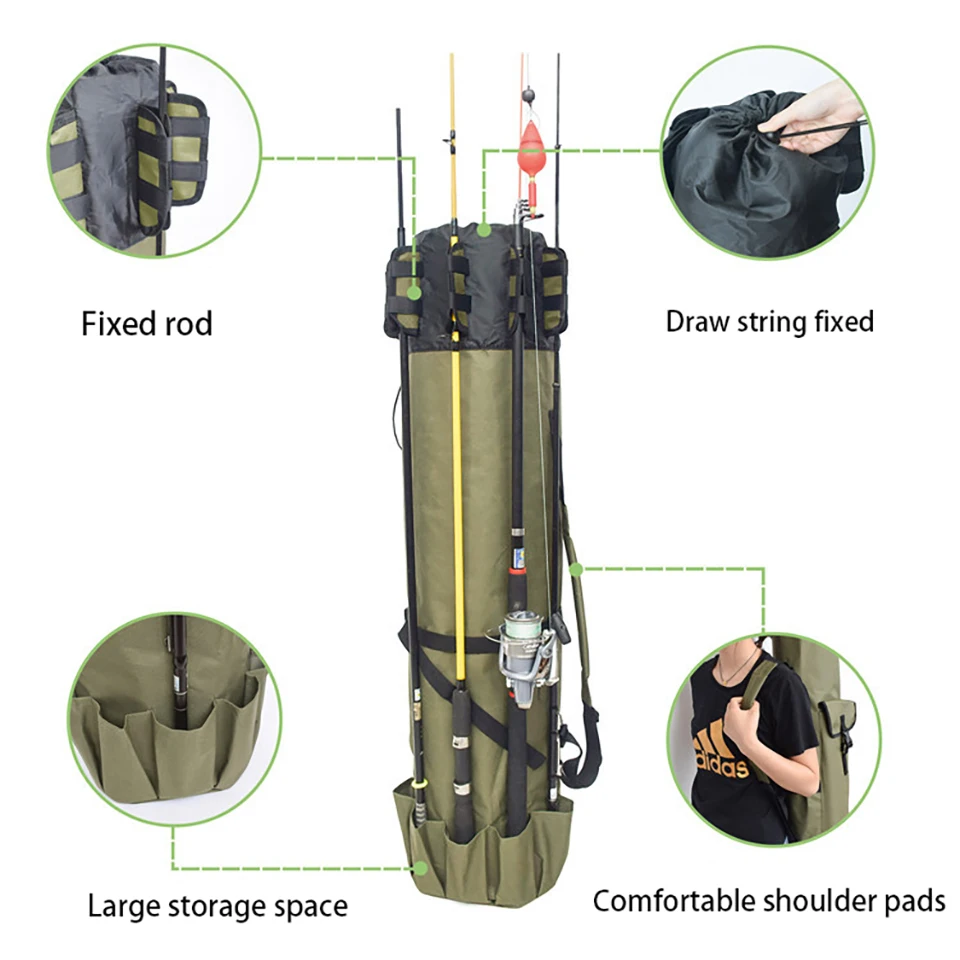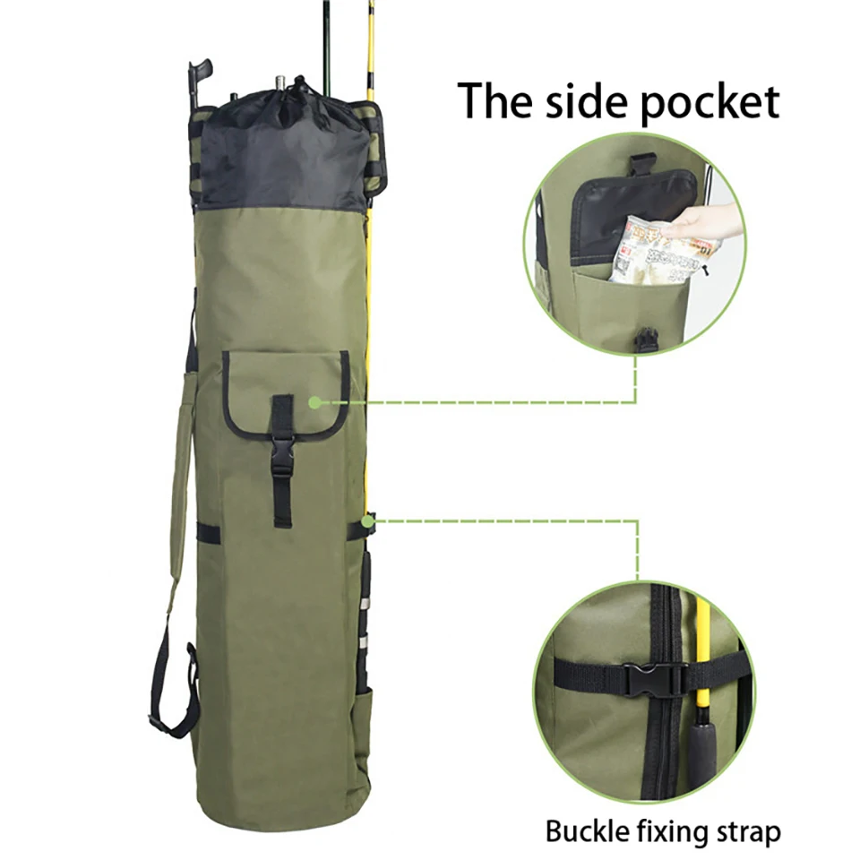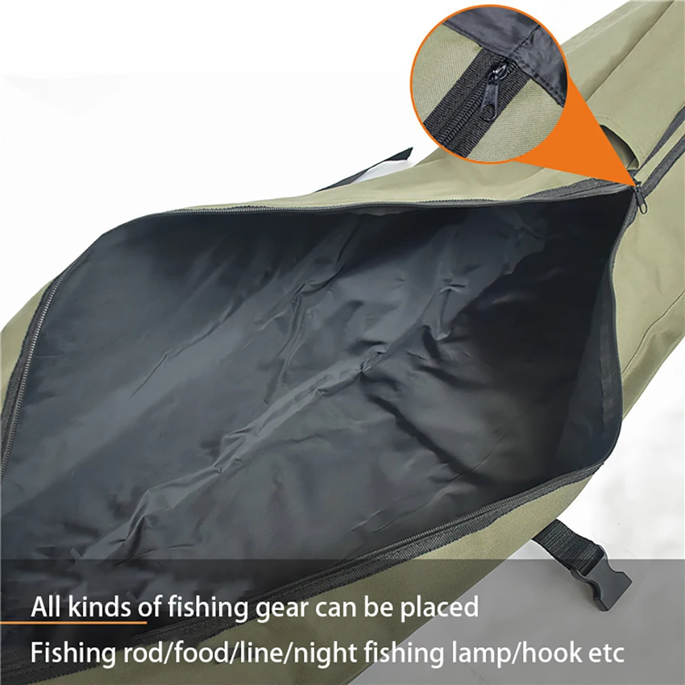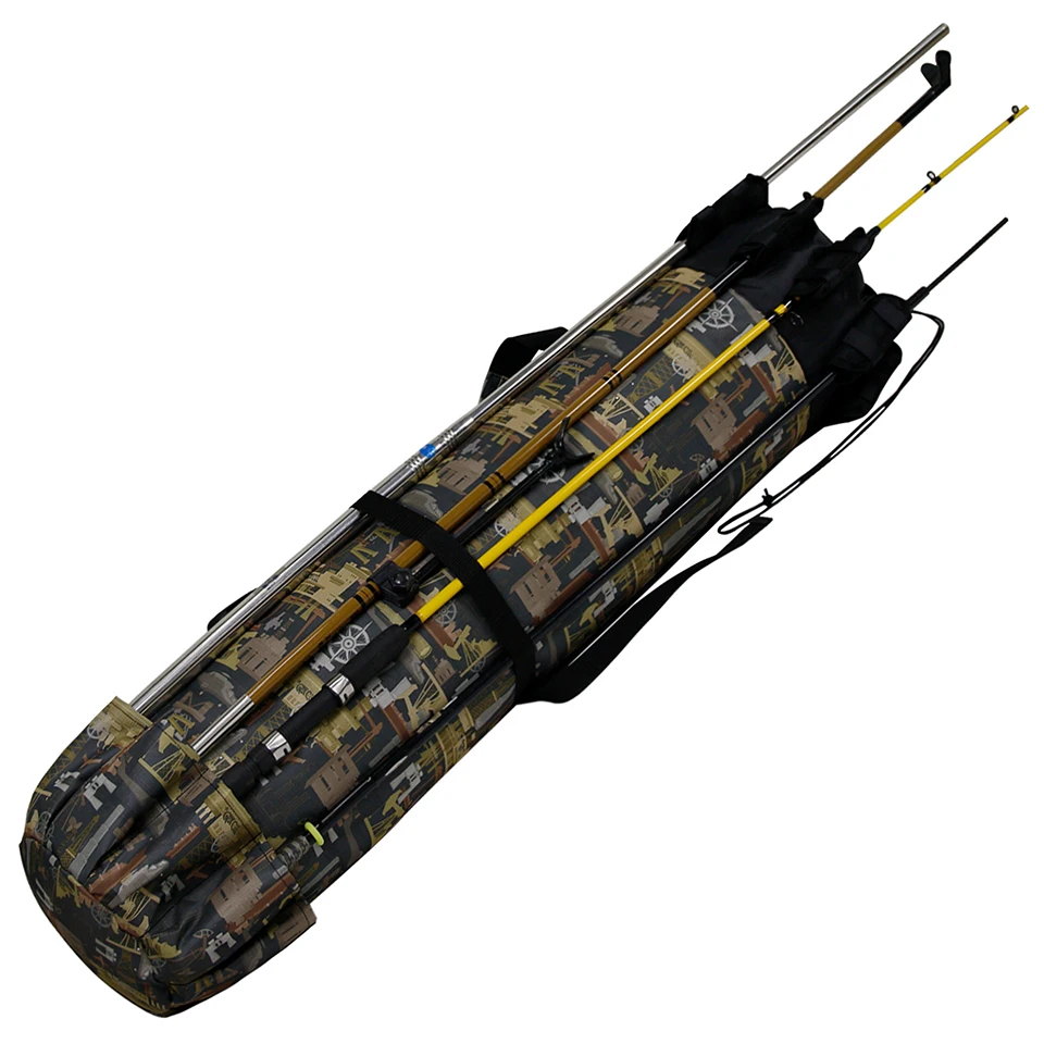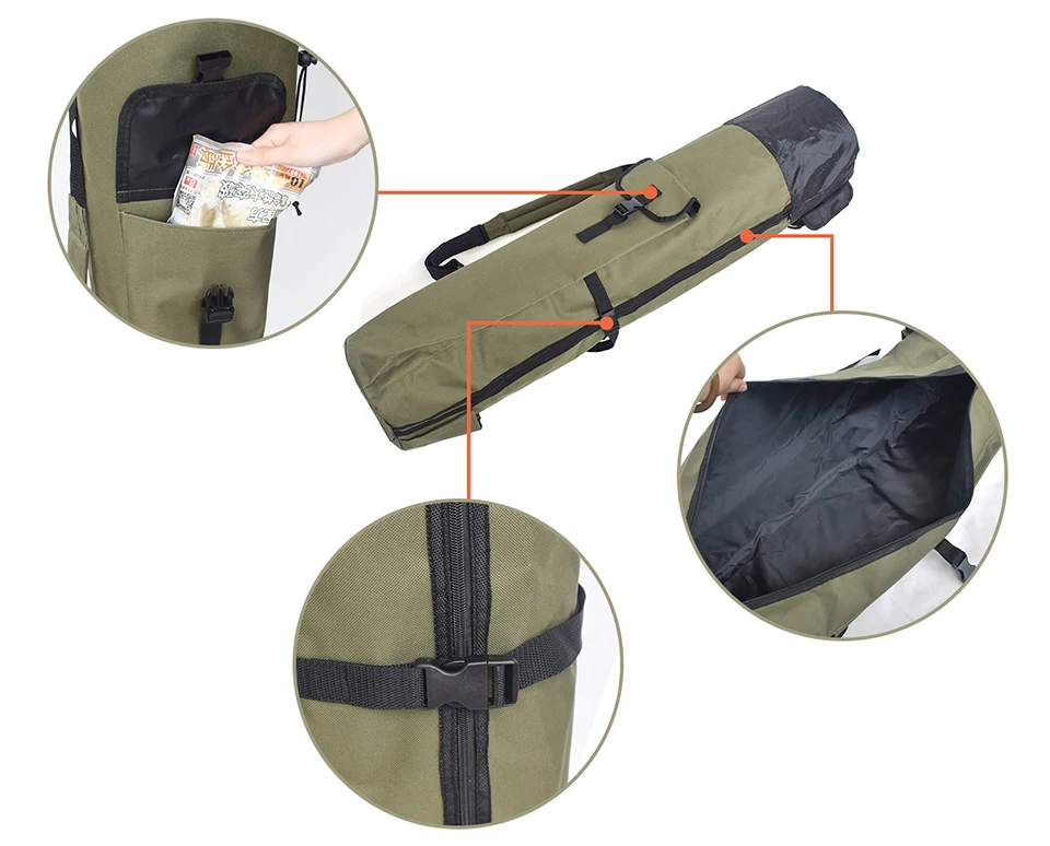 Cinco cañas y carretes en la bolsa exterior. Un bolsillo lateral y un gran compartimento interior.