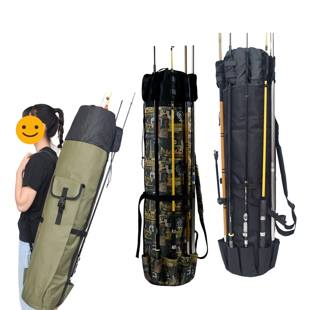 Cinco cañas y carretes en la bolsa exterior. Un bolsillo lateral y un gran compartimento interior.