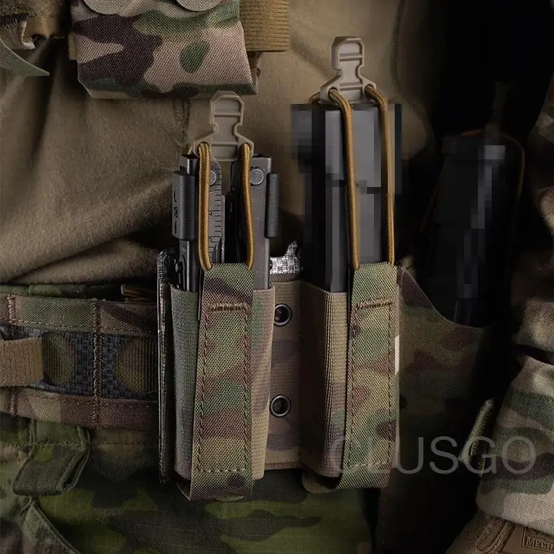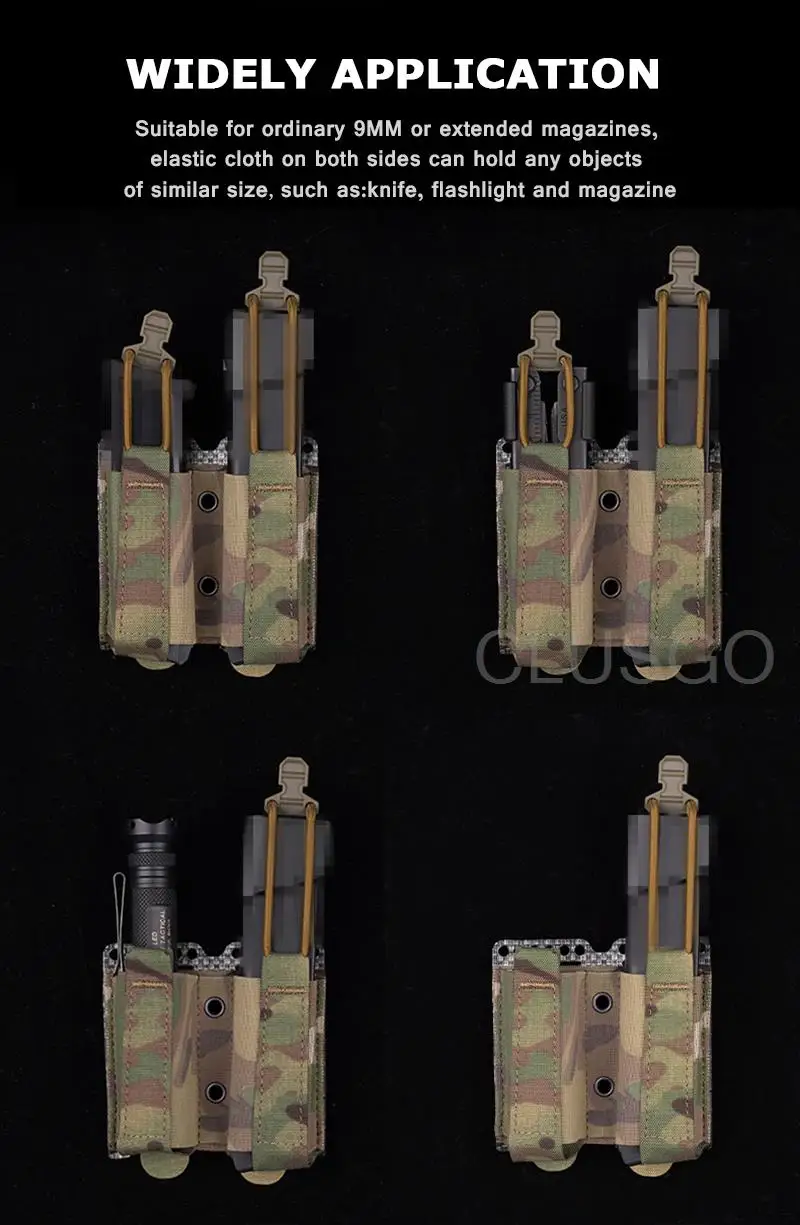 -Adecuado para revistas ordinarias de 9mm o extendidas, la tela elástica en ambos lados puede contener cualquier objeto de tamaño similar, como cuchillo, linterna y revista.