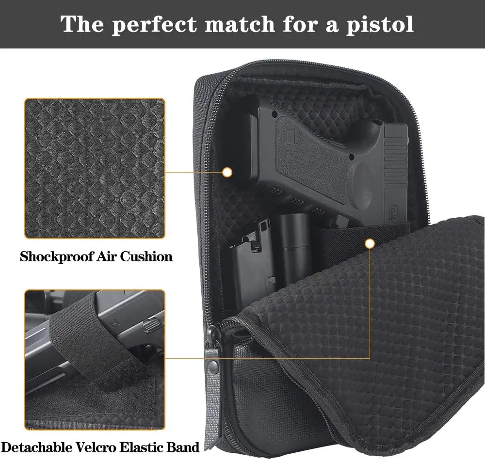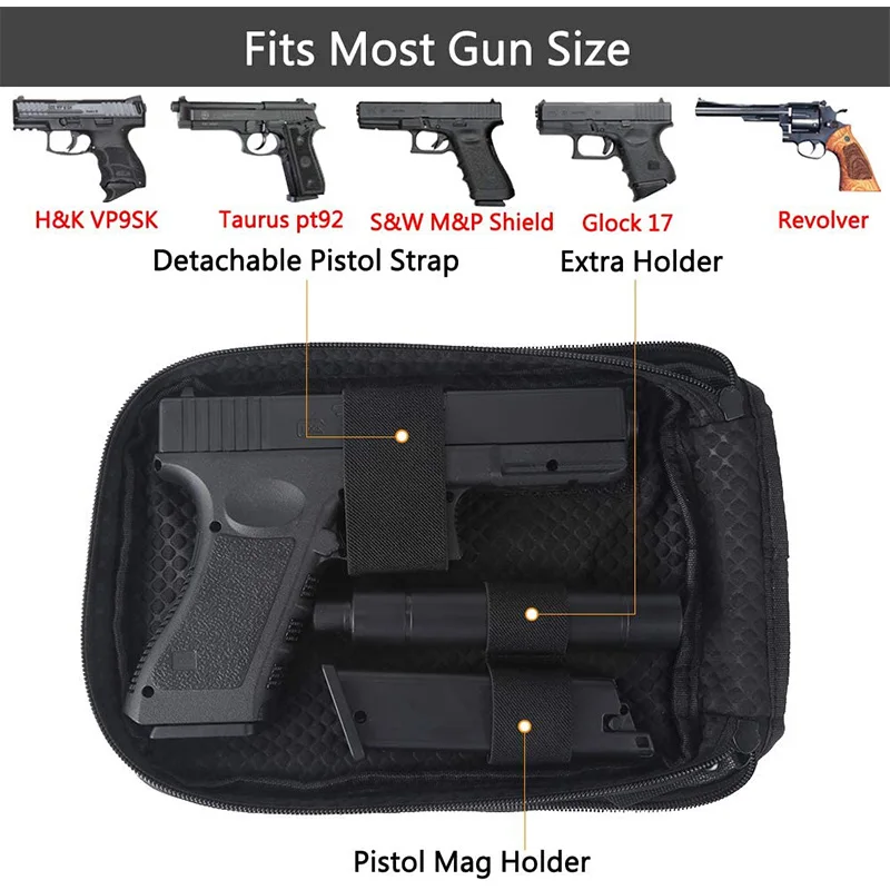 【Compatibilidad】tamaño de la bolsa de pistola: 24*18*3cm/9,4 "x 7" x 1,3 "; El tamaño práctico se adapta a la mayoría de los tipos de pistolas con una longitud máxima de 8 pulgadas en el mercado