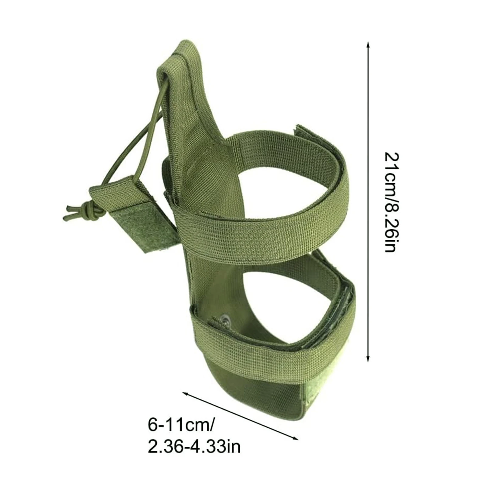 Soporte para botella de agua Molle para mochila: la bolsa para botella de agua Molle se puede cargar en la mochila. El tamaño de la correa de conexión Molle para el soporte para botella de agua es de 0,94 pulgadas, asegúrese de que el tamaño de los orificios en la estructura Molle en la mochila sea superior a 0,94 pulgadas.
