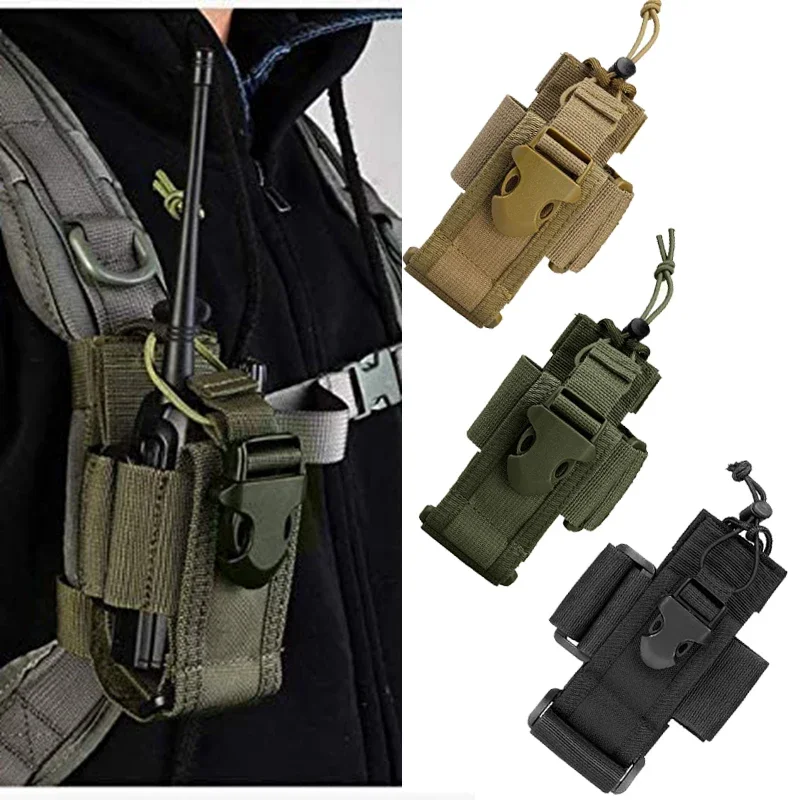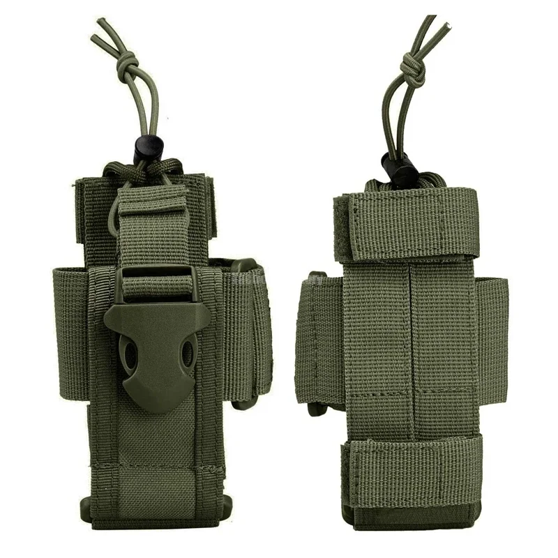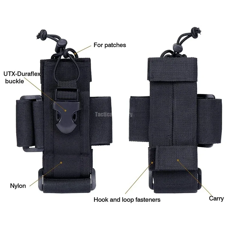 Multifunctional radio holder case, adjustable storage tools pouch; Adjustable size, two way radio holster; MOLLE System, easy to attached to MOLLE-webbed vests, rucksacks and belt Drainage hole.