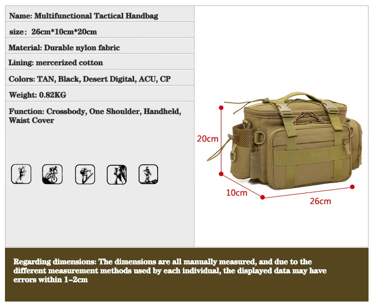 Estimado comprador:Si necesita conocer los colores de camuflaje negro y CP, comuníquese con el servicio al cliente.Especificación: largo 26 cm, ancho 10 cm, alto 20 cm