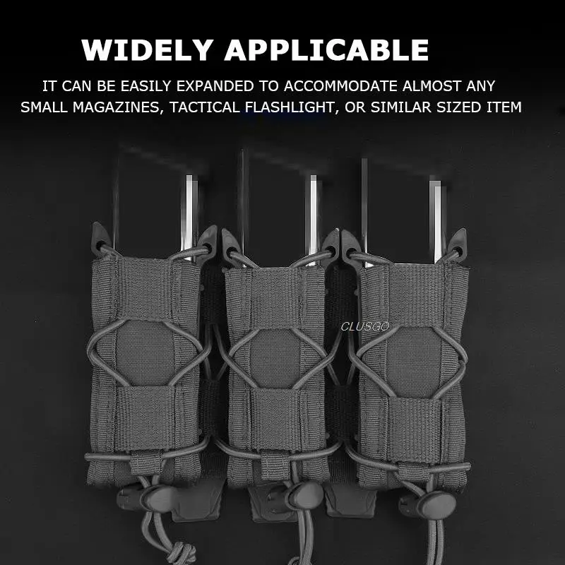 La funda del cargador de 9mm está diseñada para adaptarse a casi cualquier MAG de pistola de 9mm de tamaño, como calibre. 40 45acp , 1911,HK P8, Glock, SIG, Beretta M9, etc. También puede almacenar cuchillos plegables, linternas y otros pequeños artículos tácticos que necesite