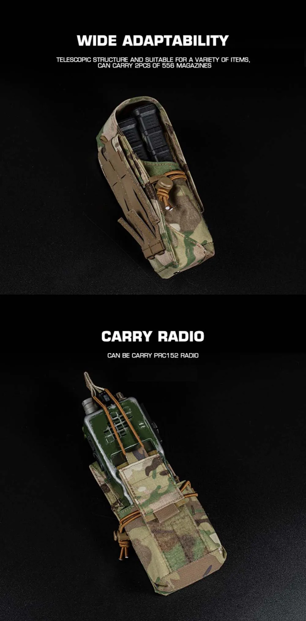 Capacidad para dos 5,56 cargadores, la mayoría de las radios.