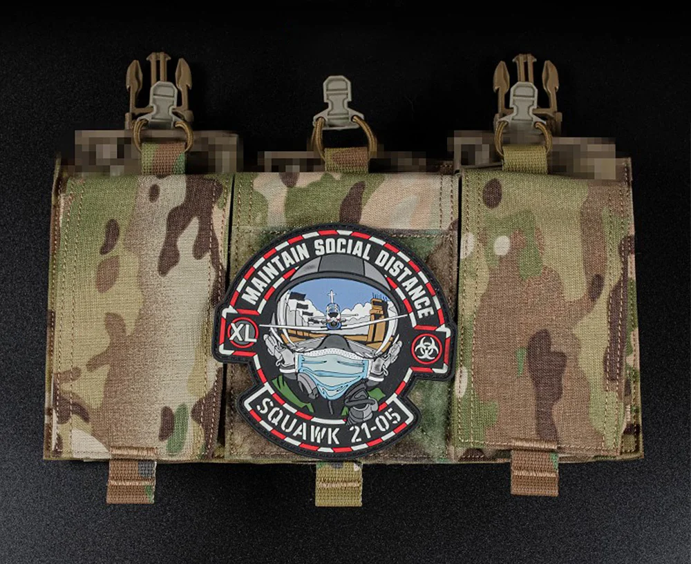 Un panel con un lazo en la solapa de la bolsa central adjunta parches de identificación.