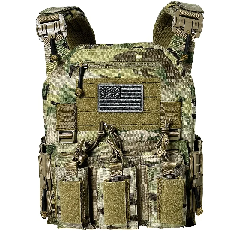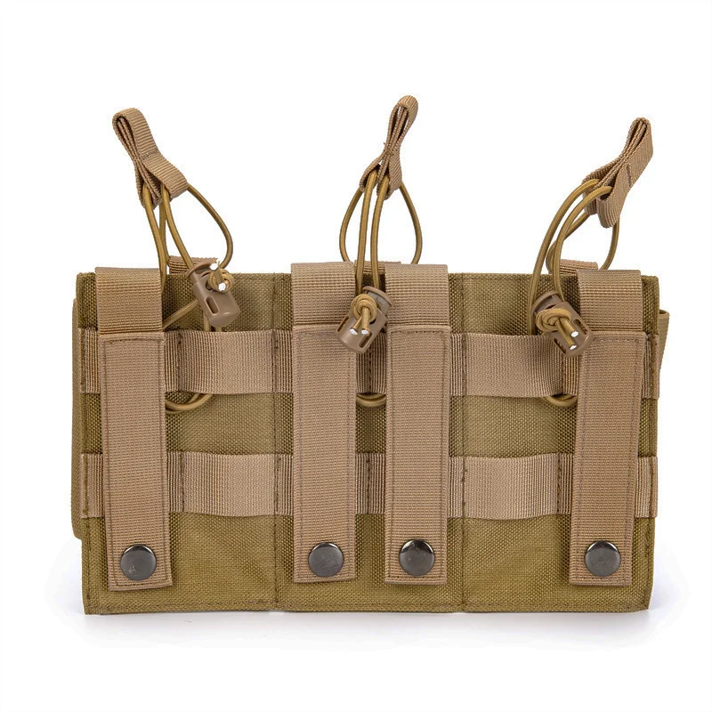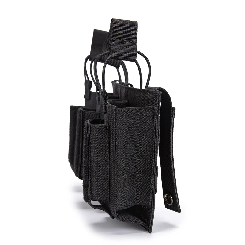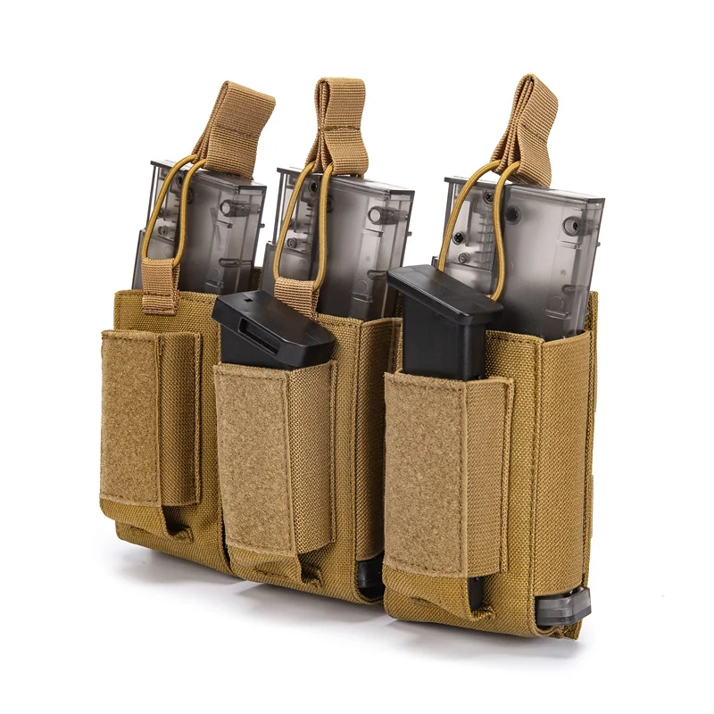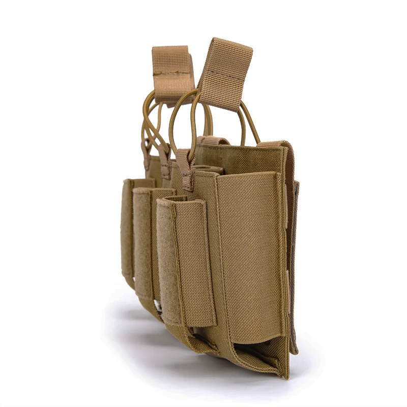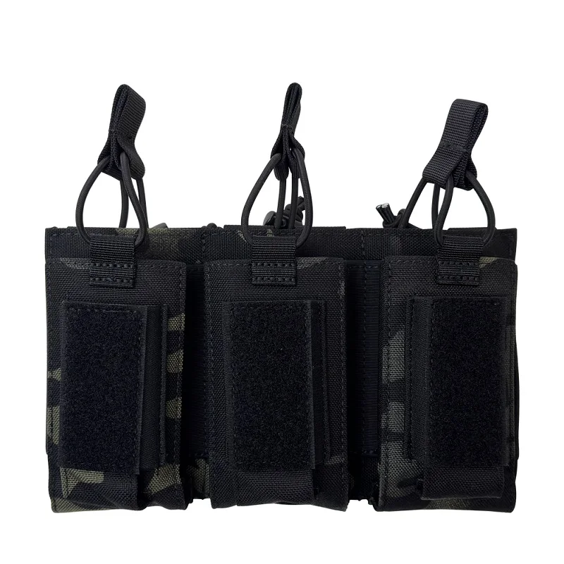 Confeccionado con tejido de nailon 1000D.la parte principal es una bolsa triple para cargadores de 5,56 y 7,62y hay una bolsa adicional de triple mahazina para pistola de 9 mm en la parte superior