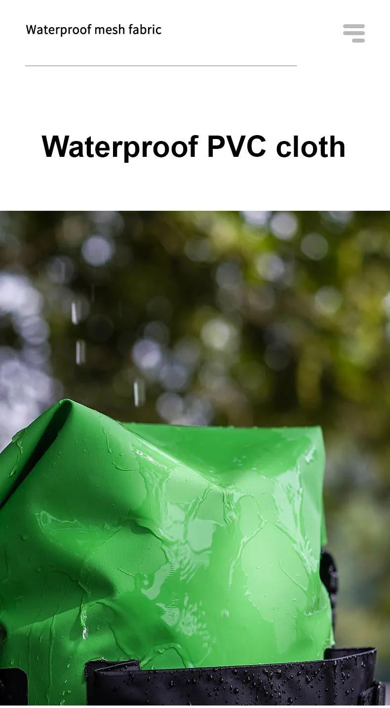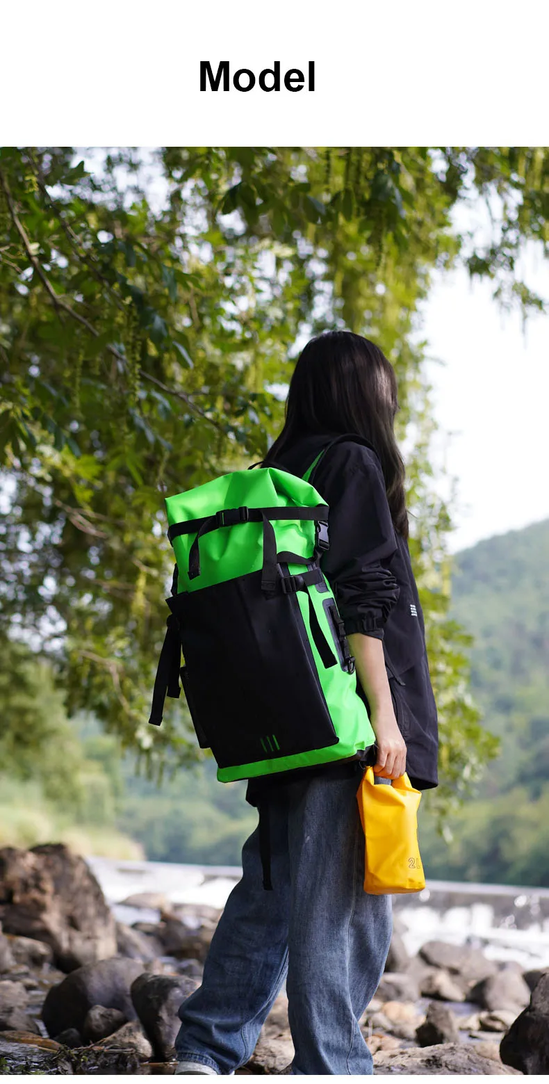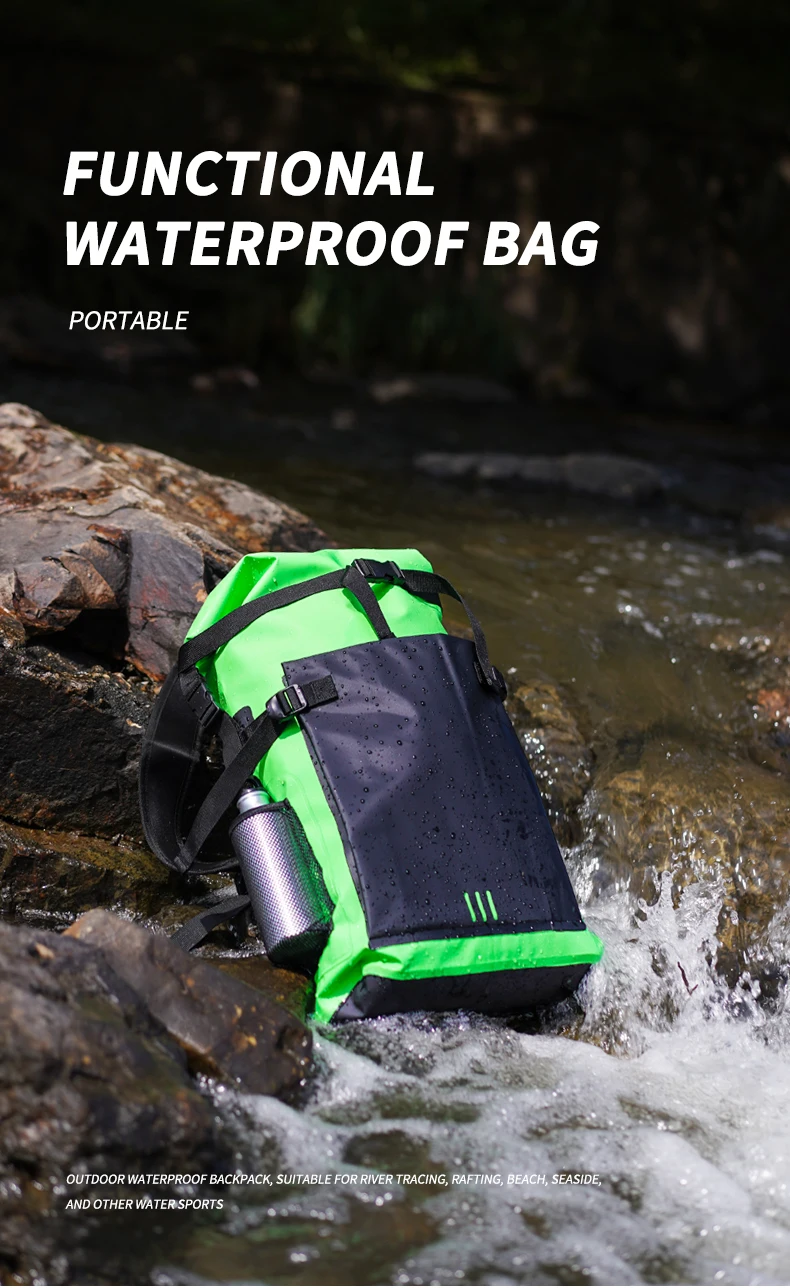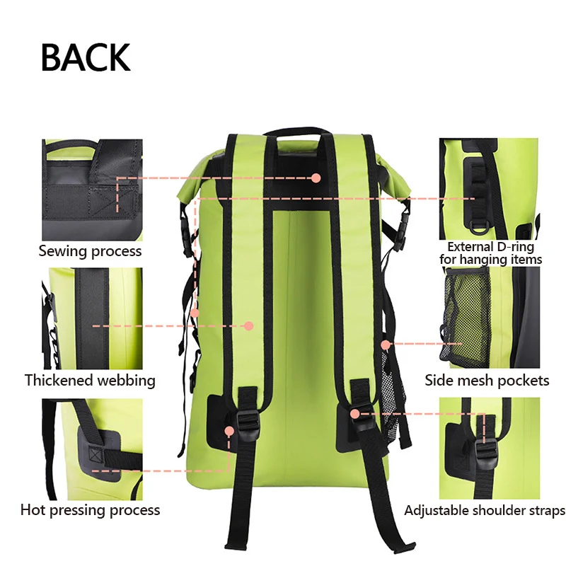 500D waterproof guarantee: applied 500D PVC high-frequency welded seams material, 30L newly dry bag backpack has strong waterproof, dust proof and tear proof performing. Water drop design of outer pouch makes this dry bag novel and special. The dry backpack is double reinforced at all the major pressure points so that it's durable enough and wear-resistant. Would absolutely be your ideal choice for any water environment you may encounter!