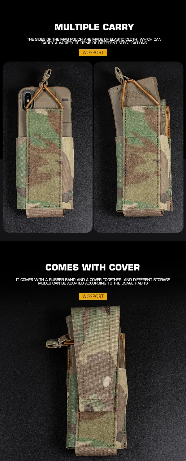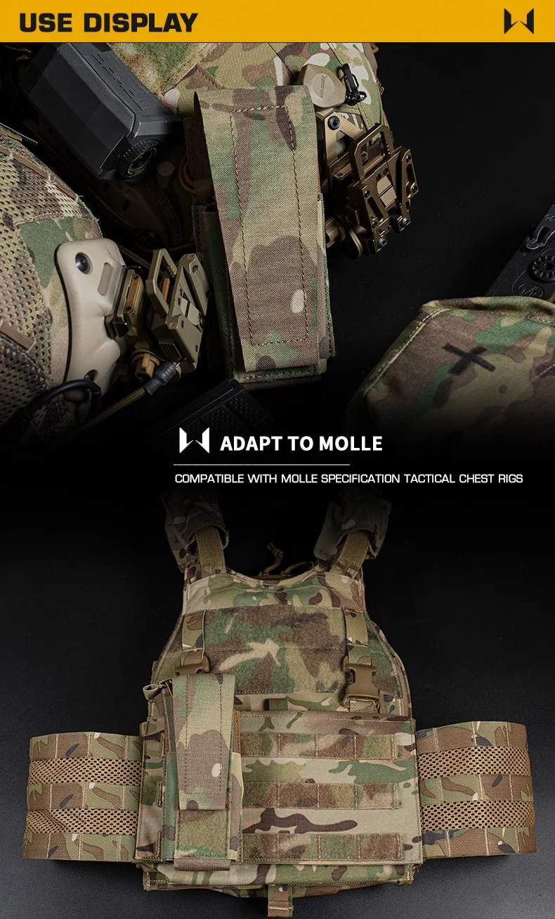 Características: - Sistema MOLLE cortado con láser. - Cordón elástico para retención. - Tiene capacidad para 5.56 revistas, teléfonos móviles u otros.