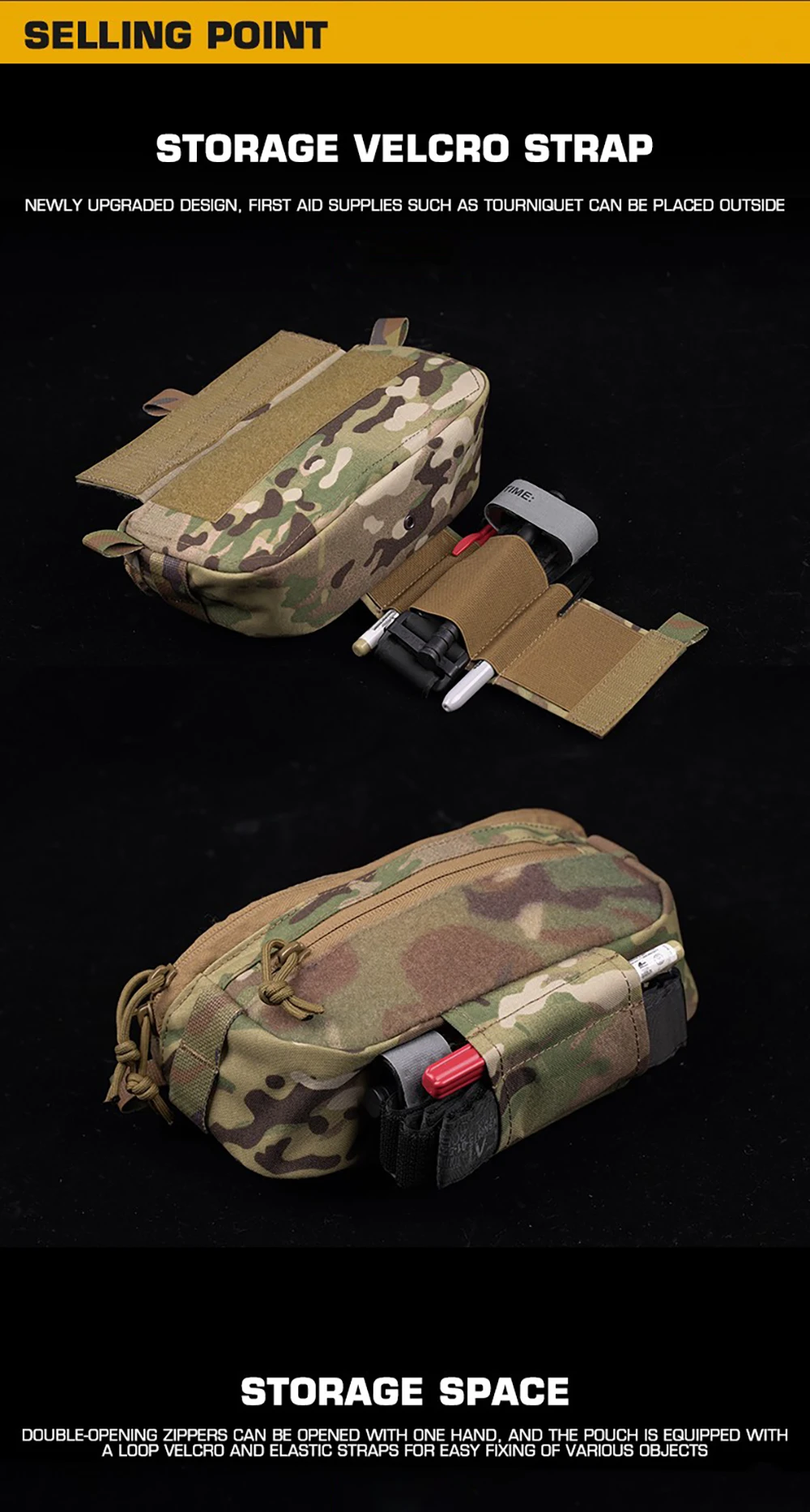 ②Doble cremallera, se puede abrir con una mano. La bolsa está equipada con velcro y correas elásticas en el interior, lo que facilita la seguridad de varios artículos.