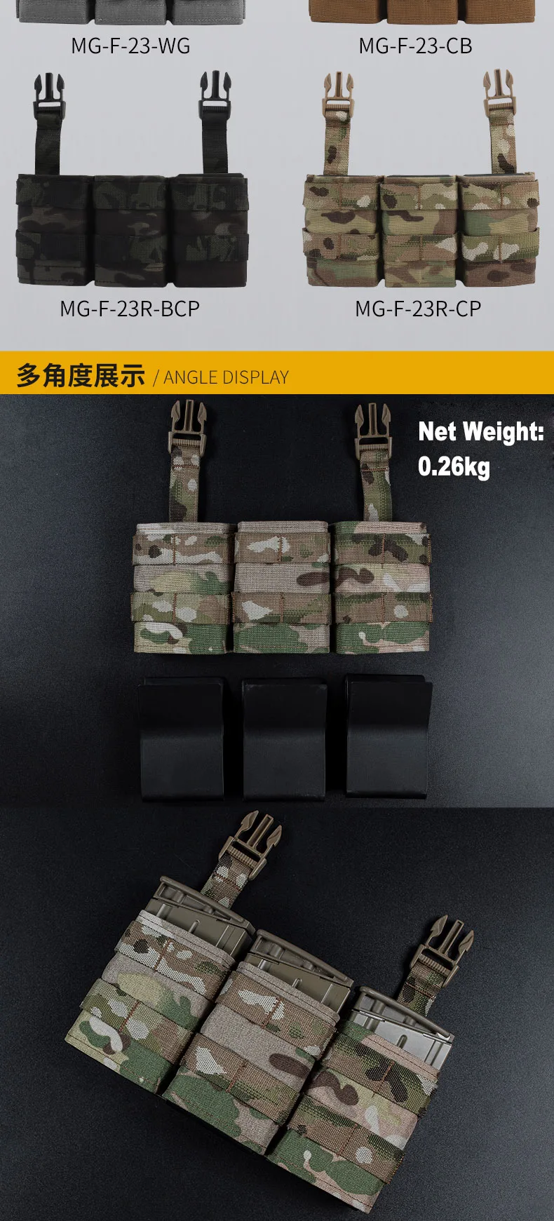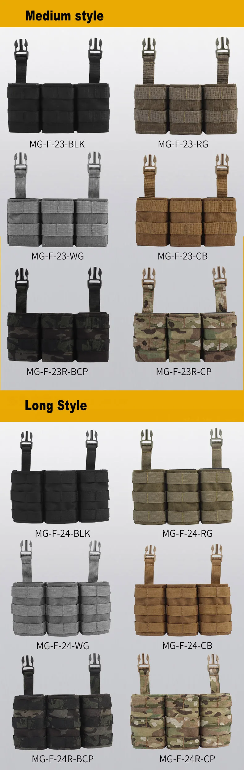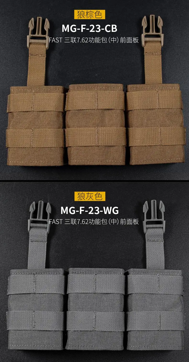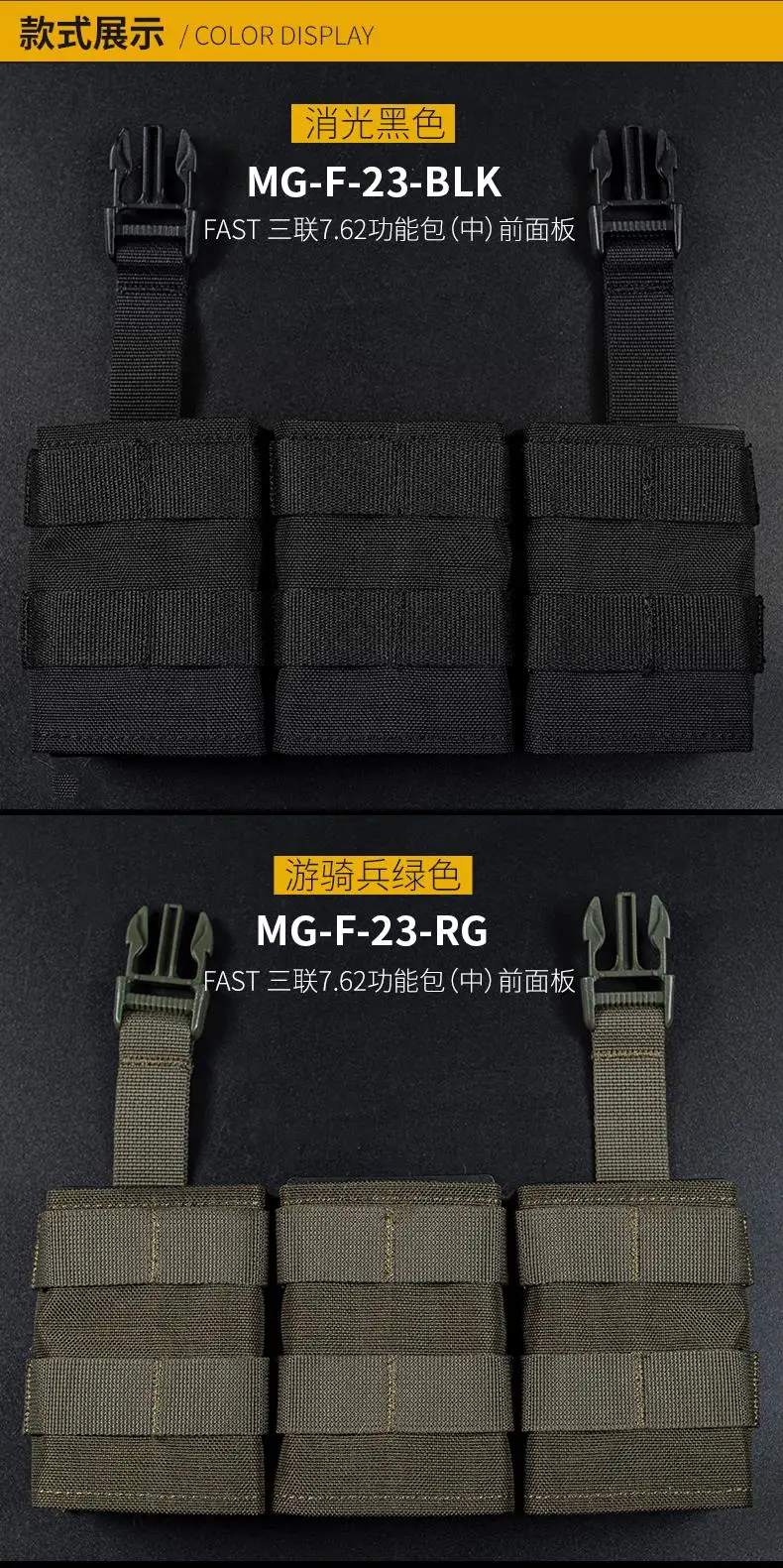 Nombre del producto: FAST 7,62 Triple Mag Pouch Panel frontal Artículo No.:MG-F-23/24 Embalaje del producto: bolsa embalada Tamaño de tipo mediano: 24x3,5x11cm Tamaño tipo largo 25,5*5*13cm Peso neto del producto: 0.245KG Peso bruto del producto: 0,3 KG Tamaños del cartón: 50x40x30cm Peso neto de la caja de cartón: 15kg Peso bruto de la caja de cartón: 16kg Material principal: tela mate/tela CORDURA