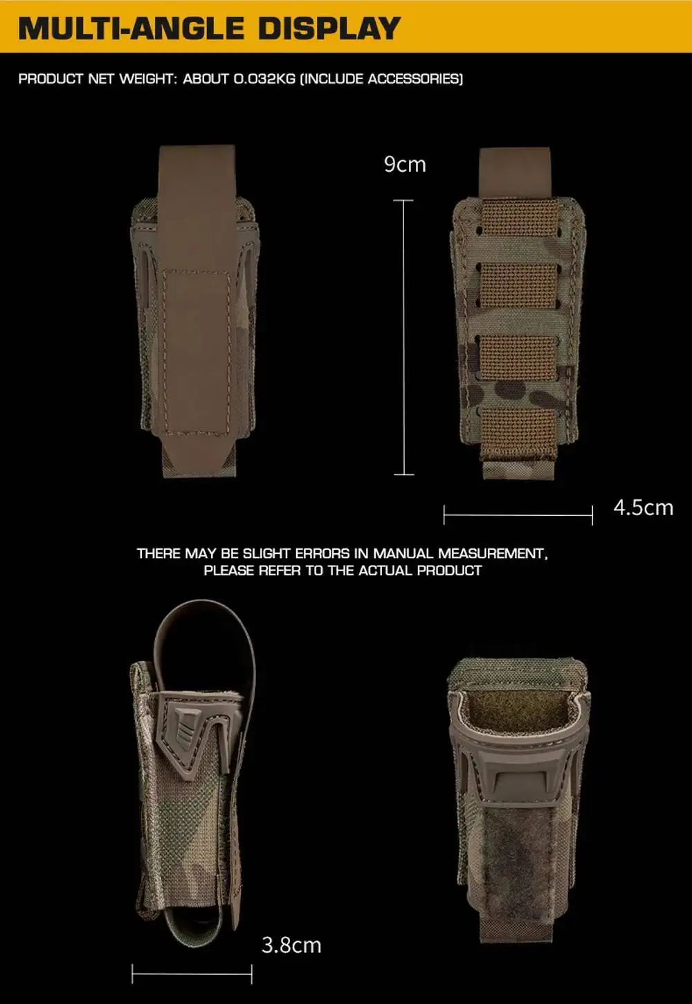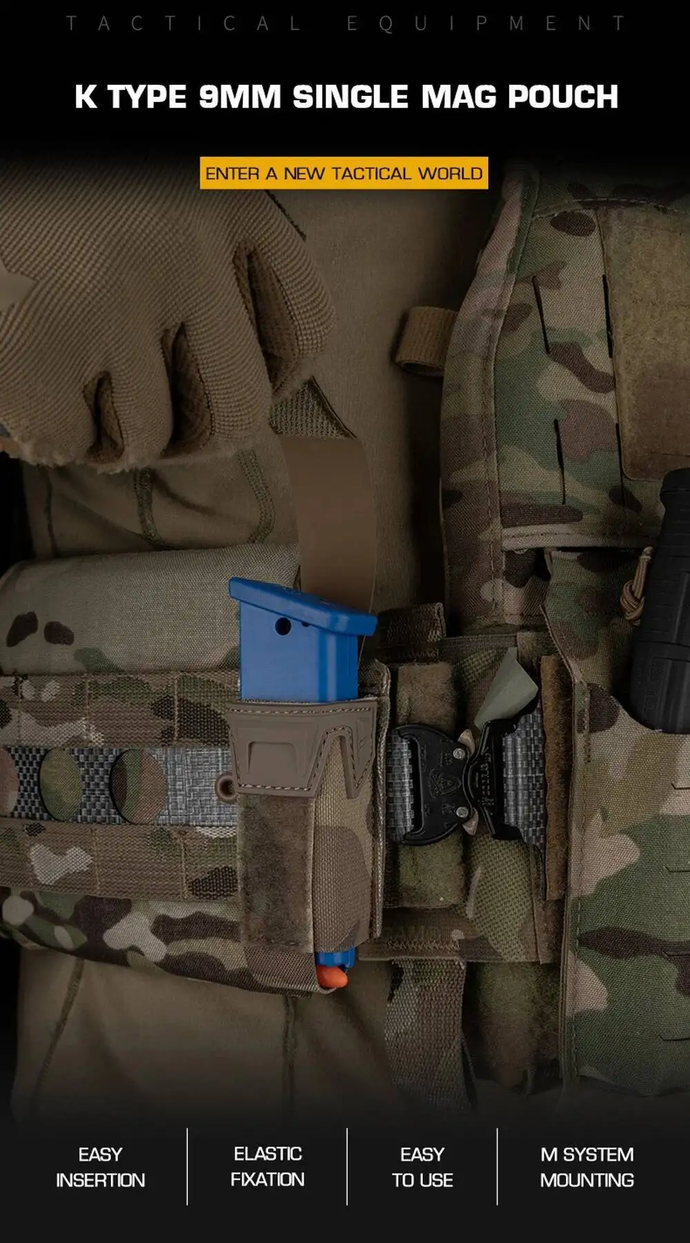 Bolsa Mag Airsoft de 9MM, bolsa para cargador de pistola estilo Agilit con placa protectora, equipo de cinturones tácticos MOLLE de liberación rápidaNombre del producto: bolsa individual tipo K de 9 mm. Tamaño del producto: 12,5*4*4cm Peso neto del producto: 0,032 KG Color del producto: negro mate/verde Ranger/marrón Coyote/MC/MCBK Material principal: Banda elástica de tela CORDURA Escena aplicable: caza, deportes al aire libre y otros juegos tácticos de Airsoft, etc.