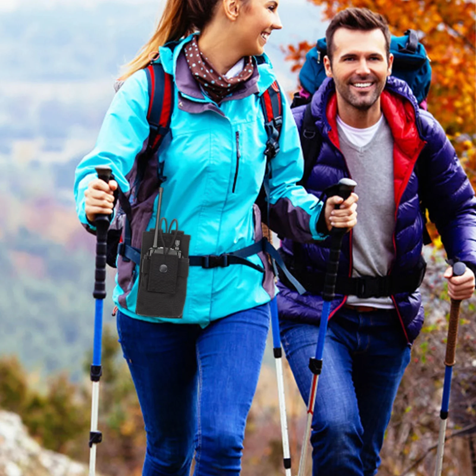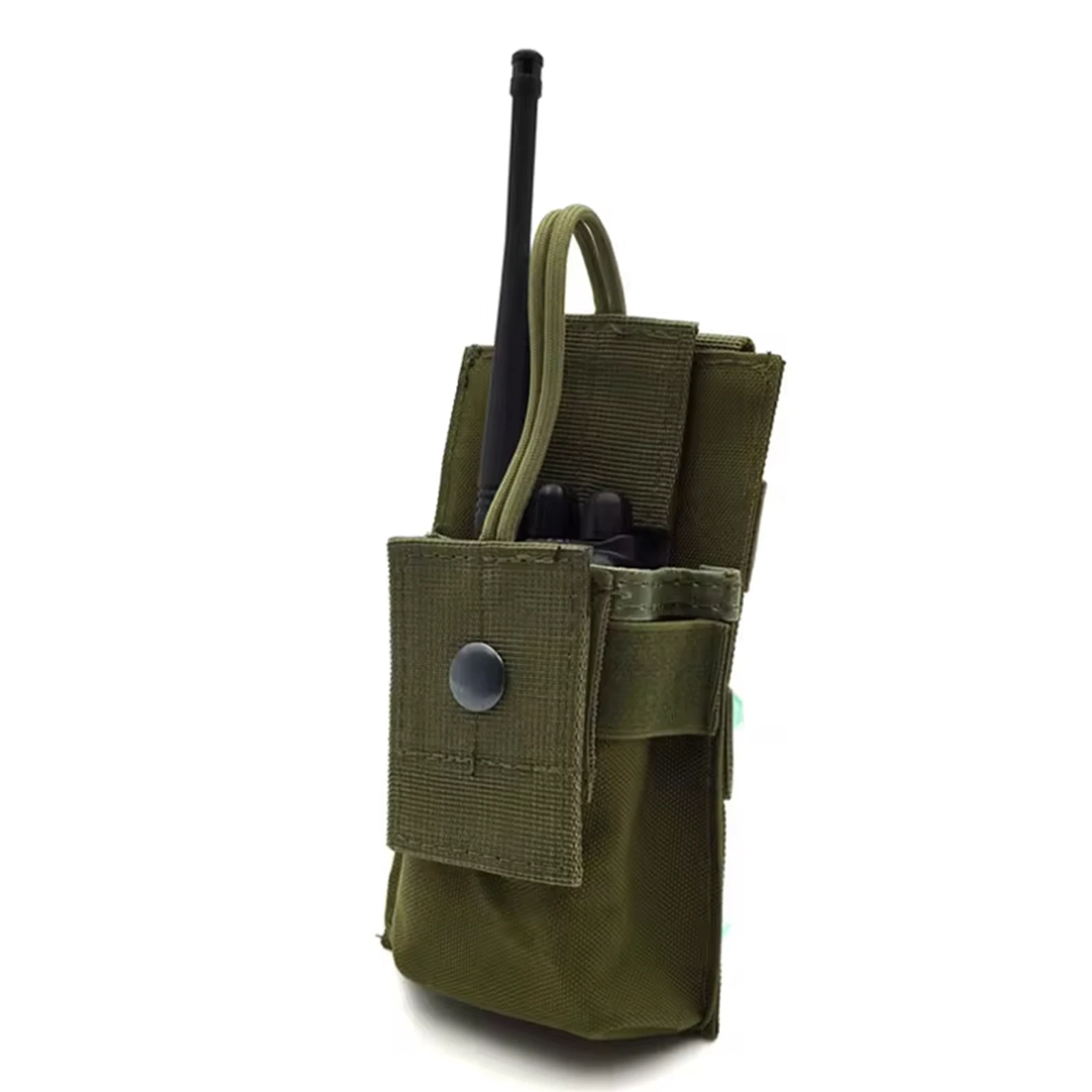 Cordón elástico y solapa de nailon con parches para asegurar la radio dentro de la bolsa.