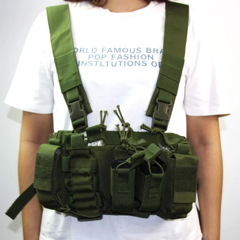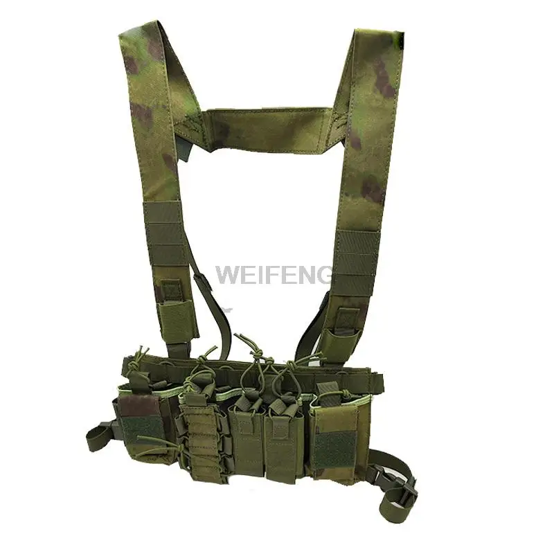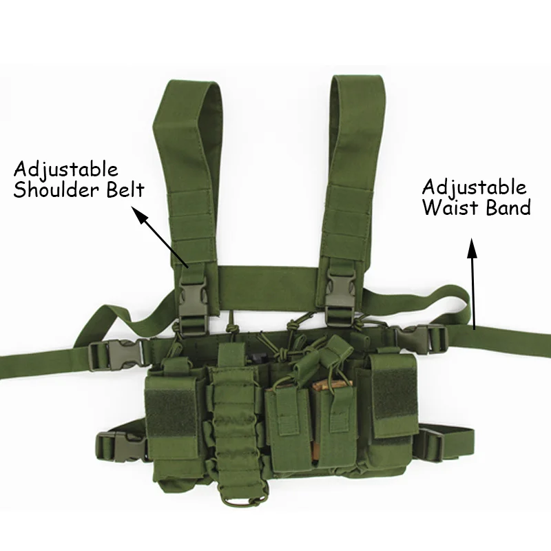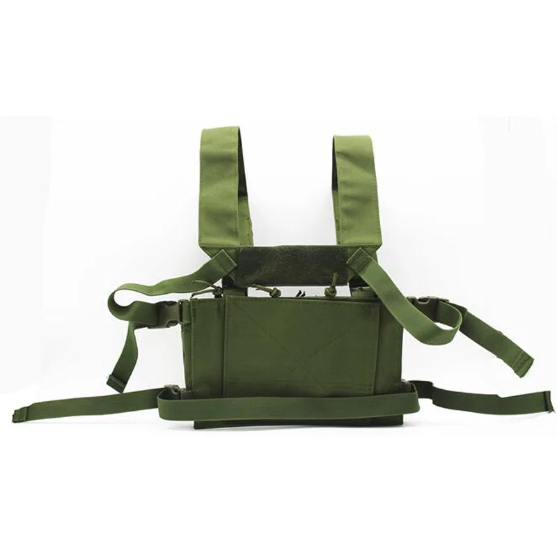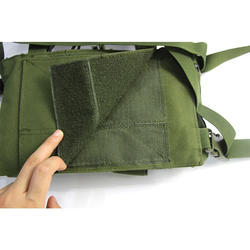 -El segundo a la izquierda es una bolsa de revista de pistola, que puede contener una revista de tamaño pequeño. Los dos bolsillos para revistas de la derecha son para bolsas de revistas de la serie M4/M16.