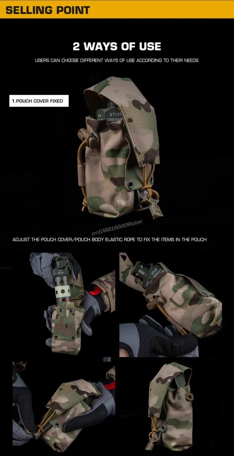 1.Solapa de retención ajustable y cierre. 2.Solapa de retención extraíble 3.Pestaña silenciosa ajustable para abrir y cerrar silenciosamente 4.Cable de choque enrutado internamente para ajuste de ancho 5.Contiene CTS Model 7290/M, CTS 8210, CTS 6210-R, Liberty Dynamics flashbang y artículos de tamaño similar. 6. 1x2 MOLLE