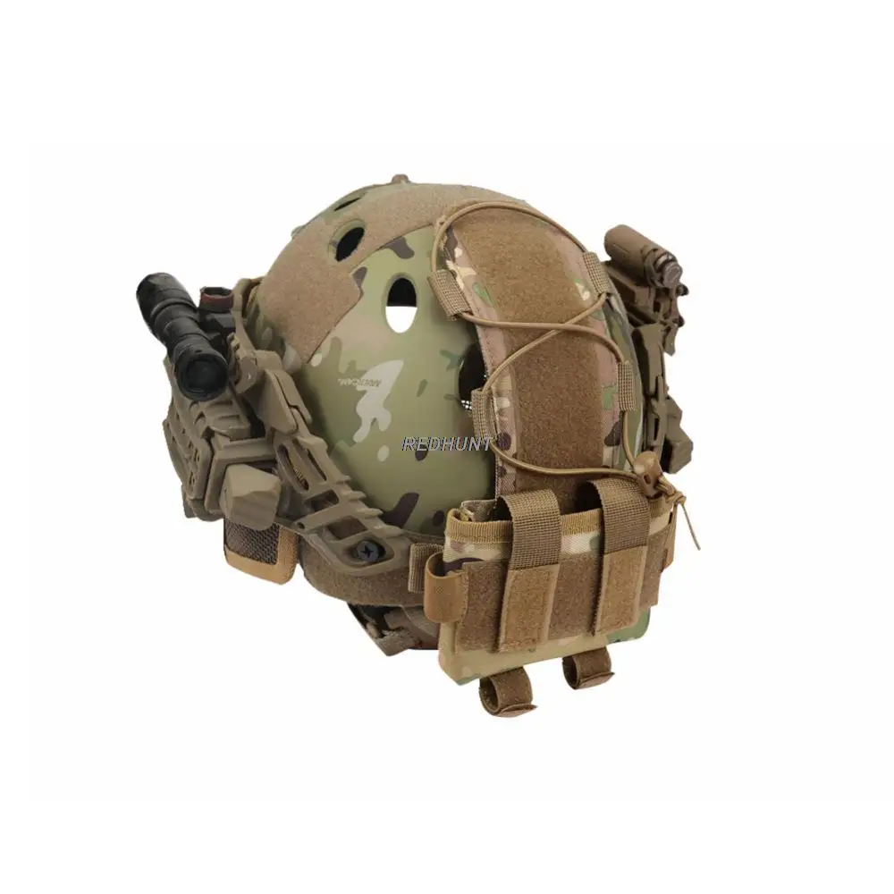 Un sistema de contrapeso/almacenamiento y retención de espectro completo para el moderno casco de combate. Una tira de superficie de velcro orientada verticalmente presenta un accesorio estroboscópico de señal.