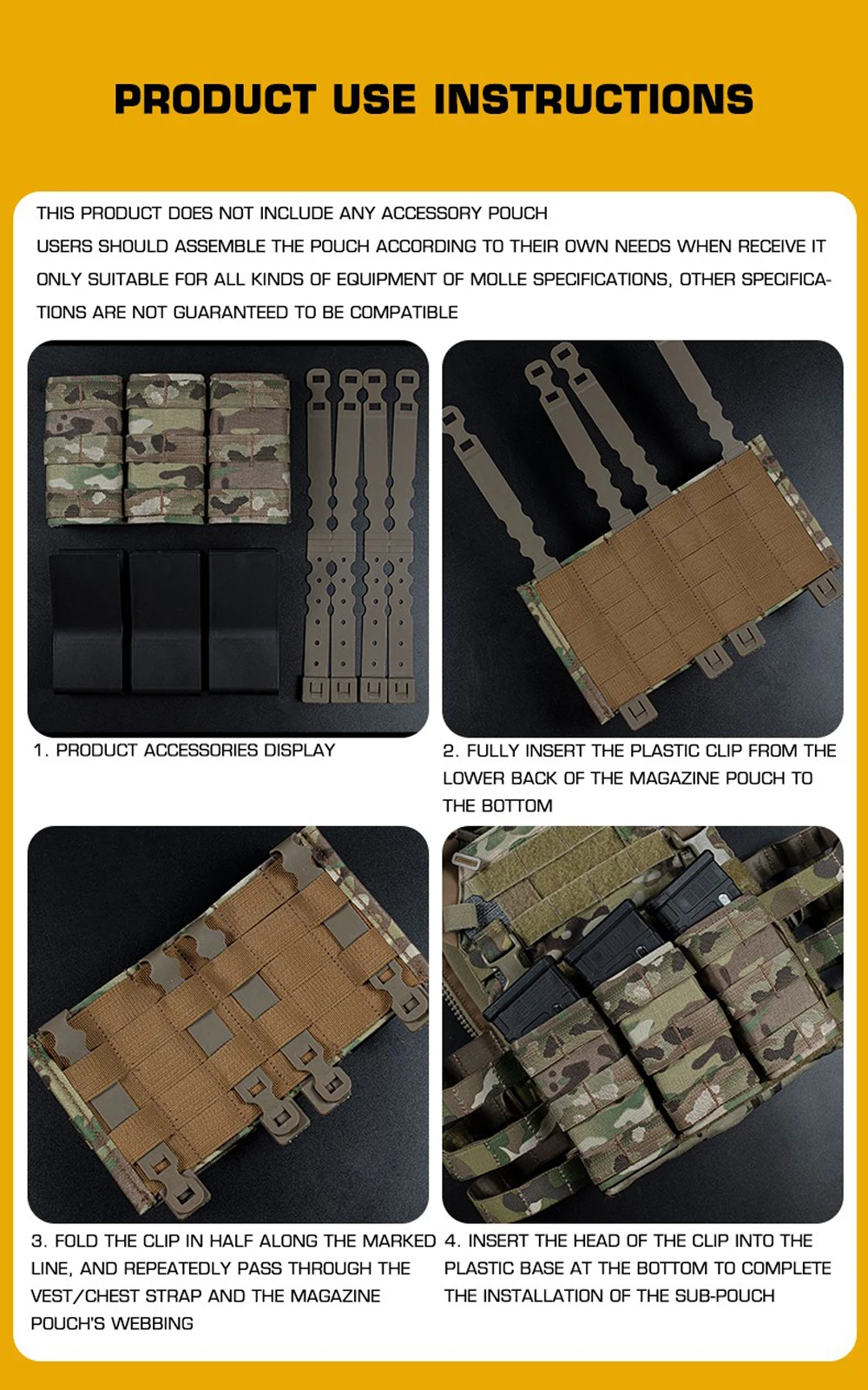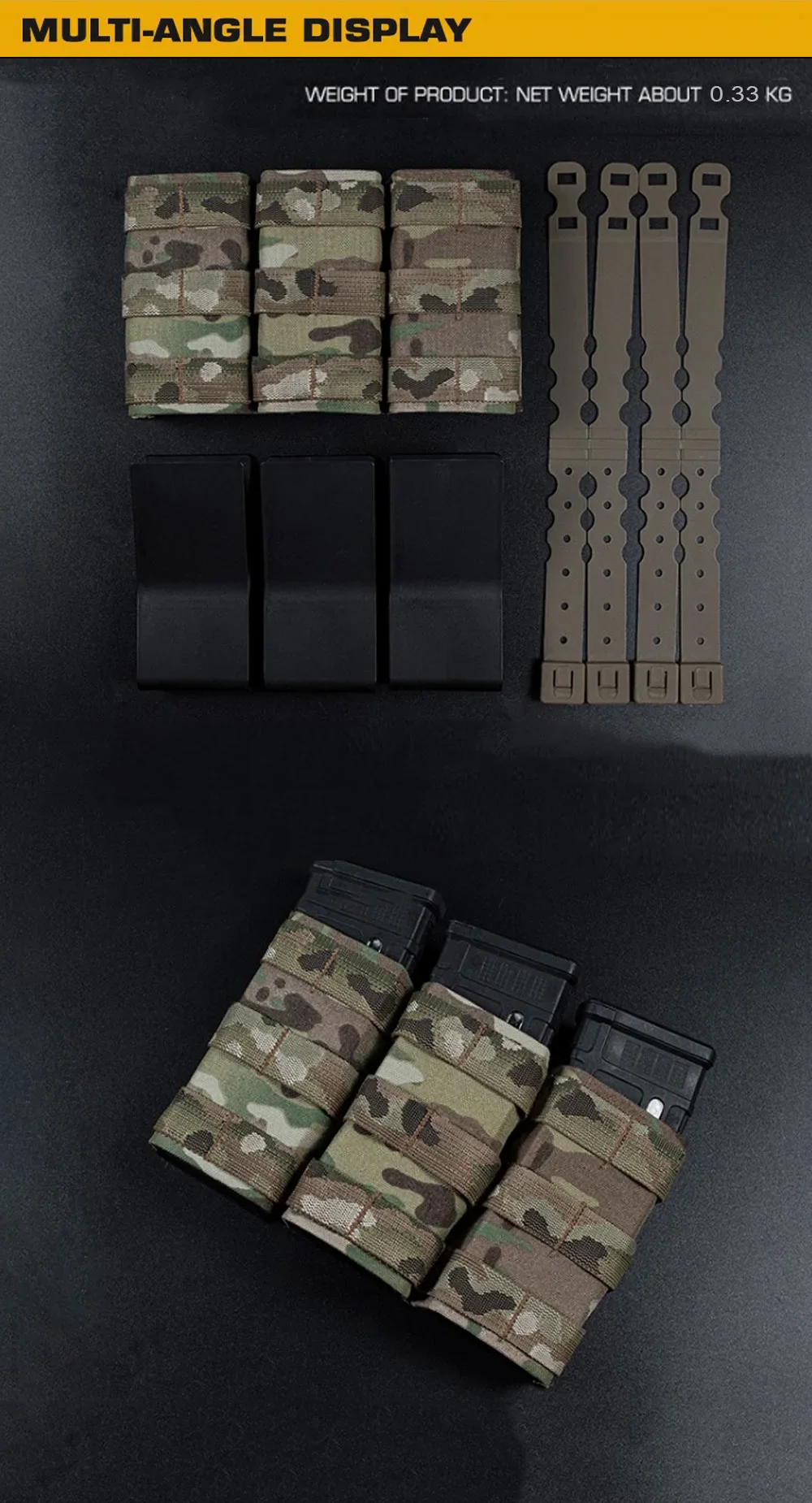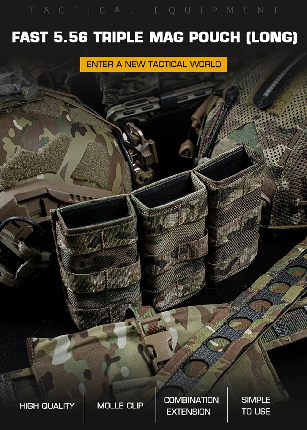 Nombre del producto: Bolsa Triple Mag Fast 5,56 (larga) Número de artículo.:MG-F-14 Tamaño del producto: 22*4*15,3 cm Peso neto del producto: 0,33 KG Material principal: tela mate/tela CORDURA. Color del producto: negro mate/gris lobo/verde Ranger/marrón coyote/Mc/BCP Escena aplicable: caza, deportes al aire libre y otros deportes tácticos de airsoft, etc.