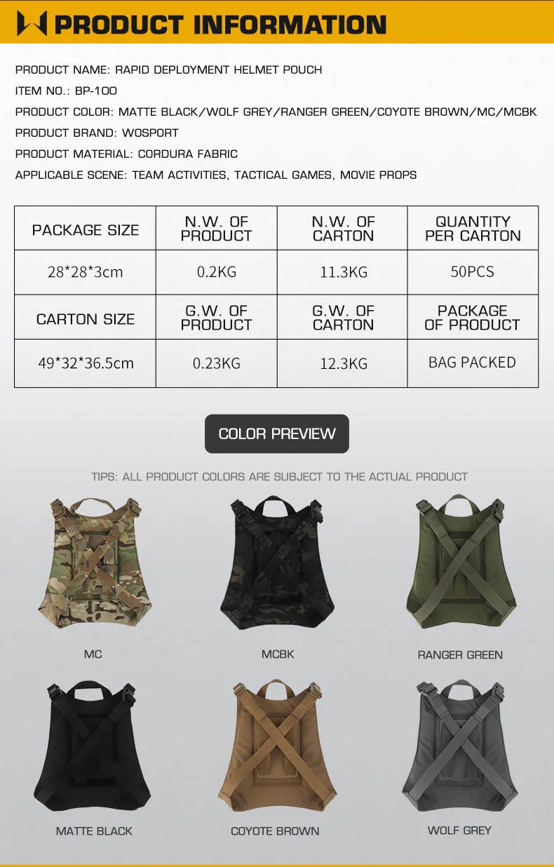 Nombre del producto: bolsa para casco de implementación rápida Número de artículo.:BP-100 Tamaño del producto: 28*28*3cm Peso neto del producto: 0,2 KG Peso bruto del producto: 0,23 KG Color del producto: negro mate/gris lobo/verde Ranger/marrón coyote/MC/MCBK Material principal: tela Cordura. Escena aplicable: caza, deportes al aire libre y otros accesorios tácticos de atletismo Airsoft CS, etc.