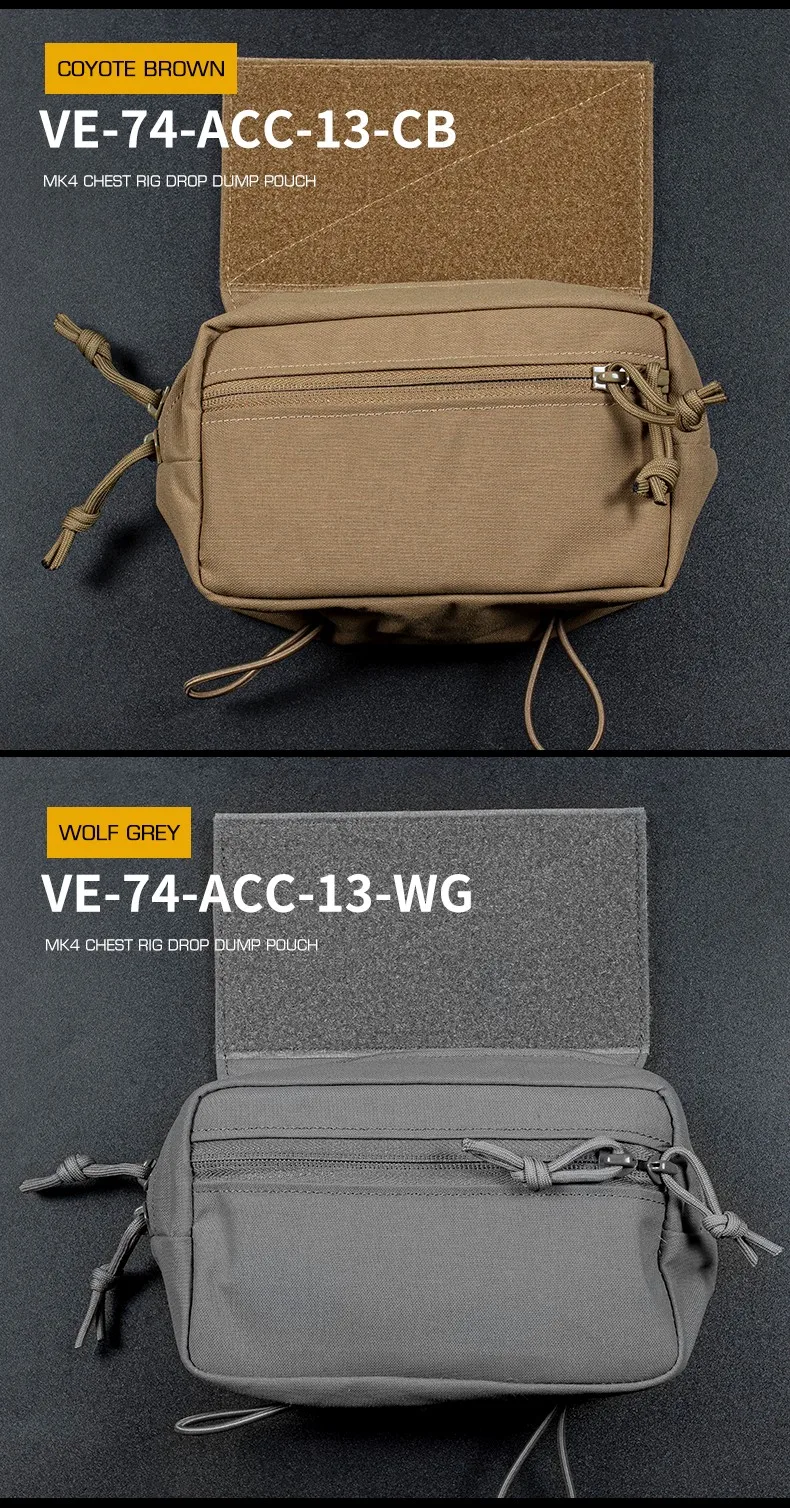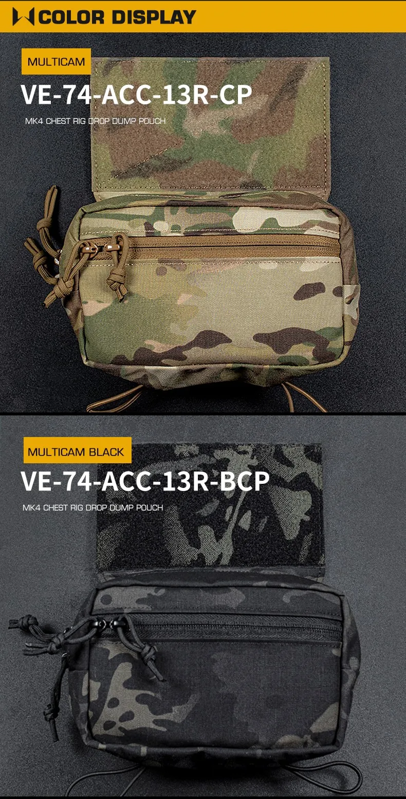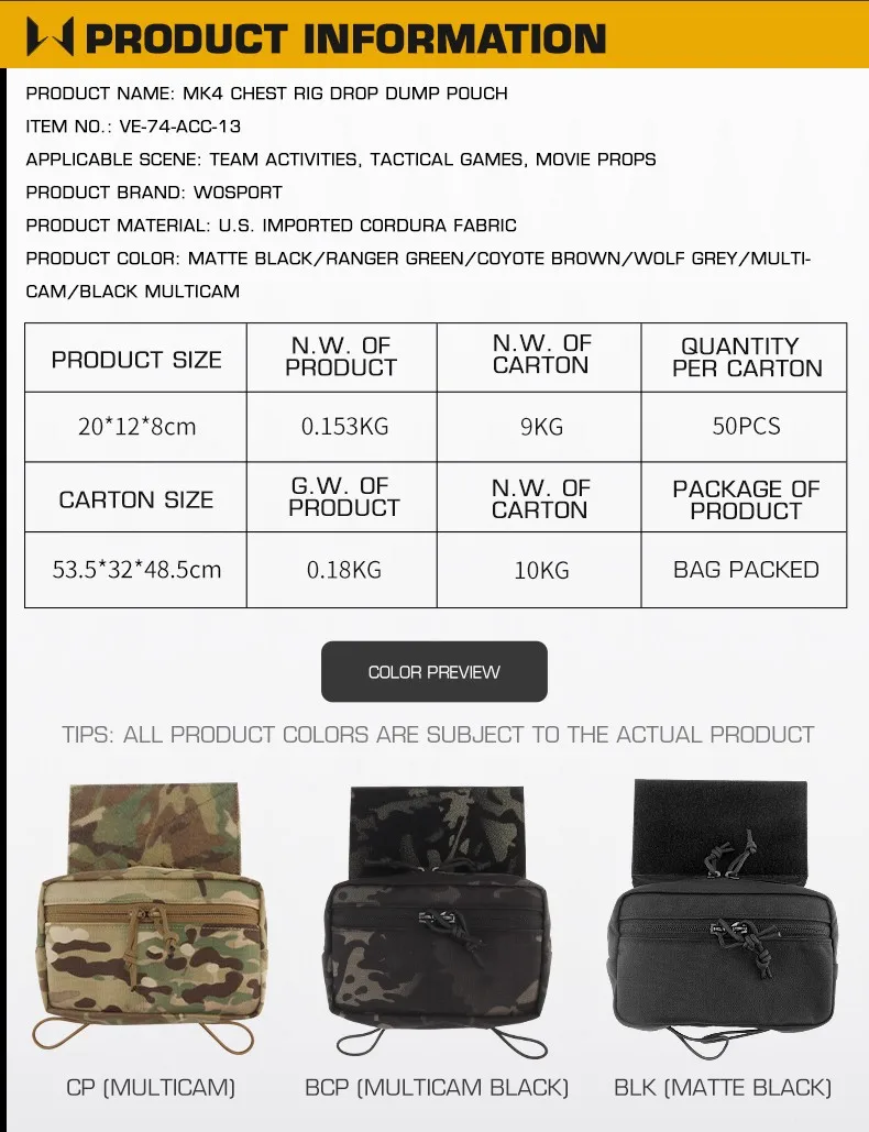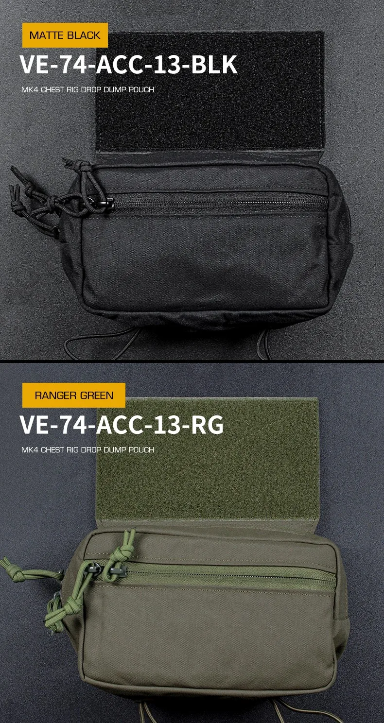 Nombre del producto: Bolsa de descarga de caída MK4 Chest Rig N. ° de artículo: VE-74-ACC-13 Embalaje del producto: bolsa embalada Tamaño del producto: 20x12x8cm Peso neto del producto: 0.153KG Peso bruto del producto: 0,18 KG Color del producto: negro mate/Verde Ranger/Marrón Coyote/gris Lobo/Multicam negro Escena aplicable: actividades de equipo, juegos tácticos, accesorios de películas Material principal: nailon de alta calidad Paquete incluido: 1 * bolsa táctica