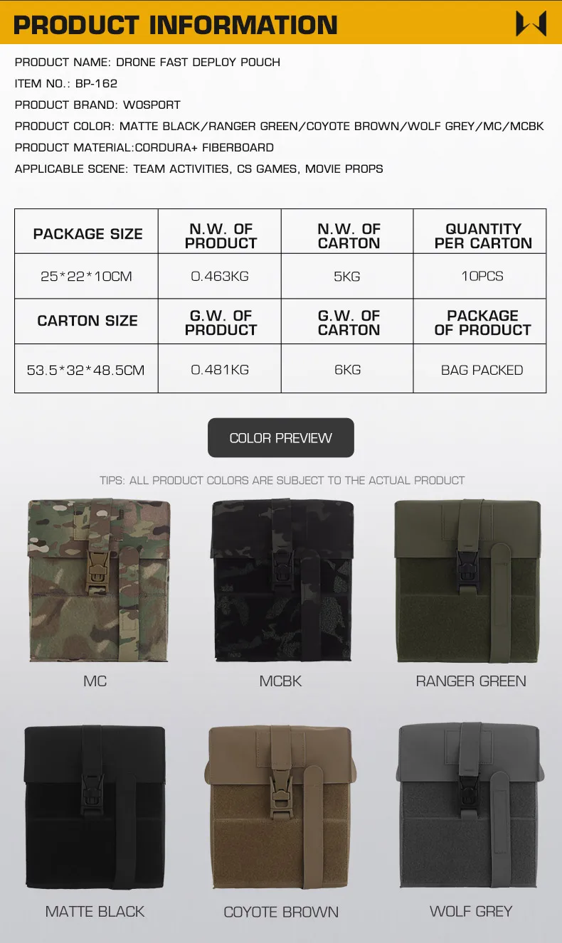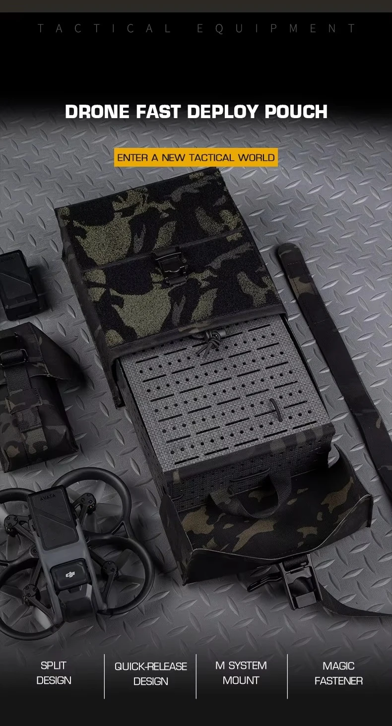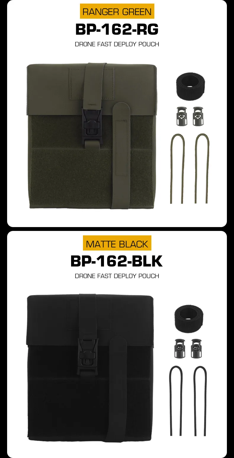 La bolsa de despliegue rápido MOLLE DRONE de diseño dividido se puede usar con la bolsa del controlador de drones para el juego CS Nombre del producto: Bolsa de despliegue rápido DRONE Artículo No.: BP-162 Color del producto: Negro mate/Verde Ranger/Marrón Coyote/Gris Wolf/MC/MCBK Material del producto: Cordura + Tablero de fibra. Escena aplicable: actividades de equipo, juegos CS, accesorios de película.