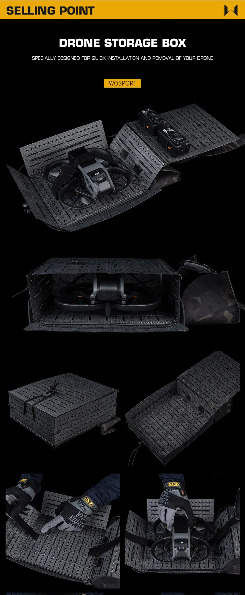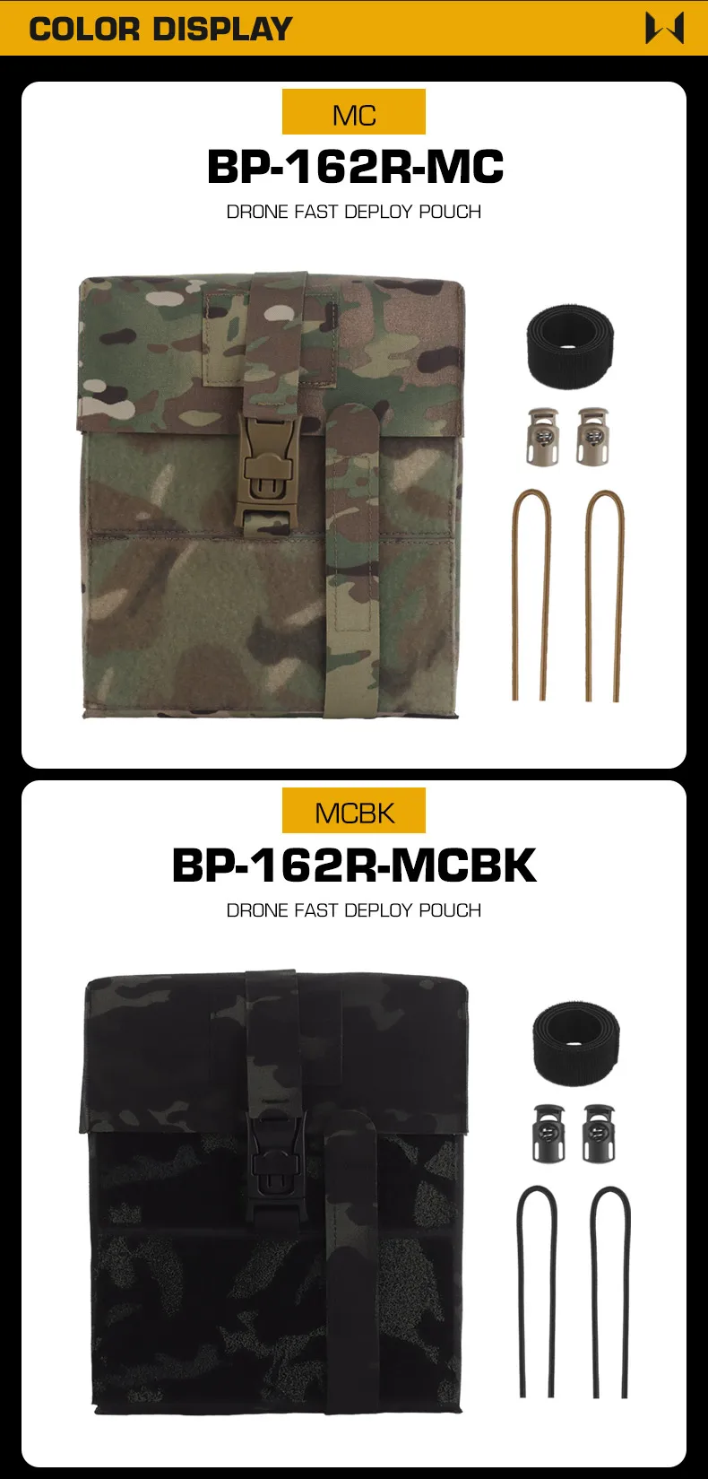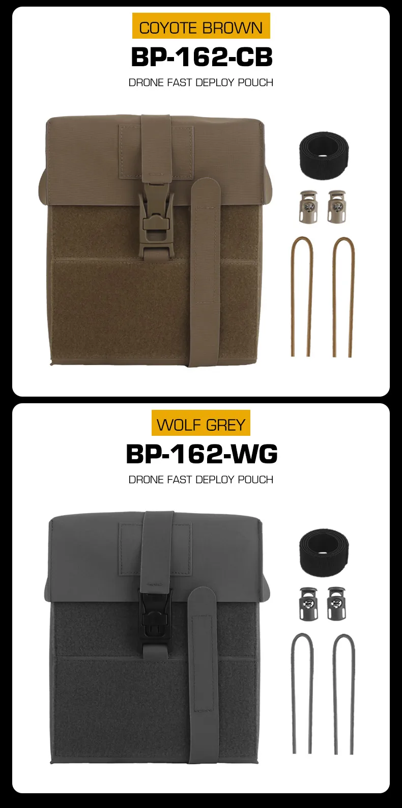La bolsa de despliegue rápido MOLLE DRONE de diseño dividido se puede usar con la bolsa del controlador de drones para el juego CS Nombre del producto: Bolsa de despliegue rápido DRONE Artículo No.: BP-162 Color del producto: Negro mate/Verde Ranger/Marrón Coyote/Gris Wolf/MC/MCBK Material del producto: Cordura + Tablero de fibra. Escena aplicable: actividades de equipo, juegos CS, accesorios de película.