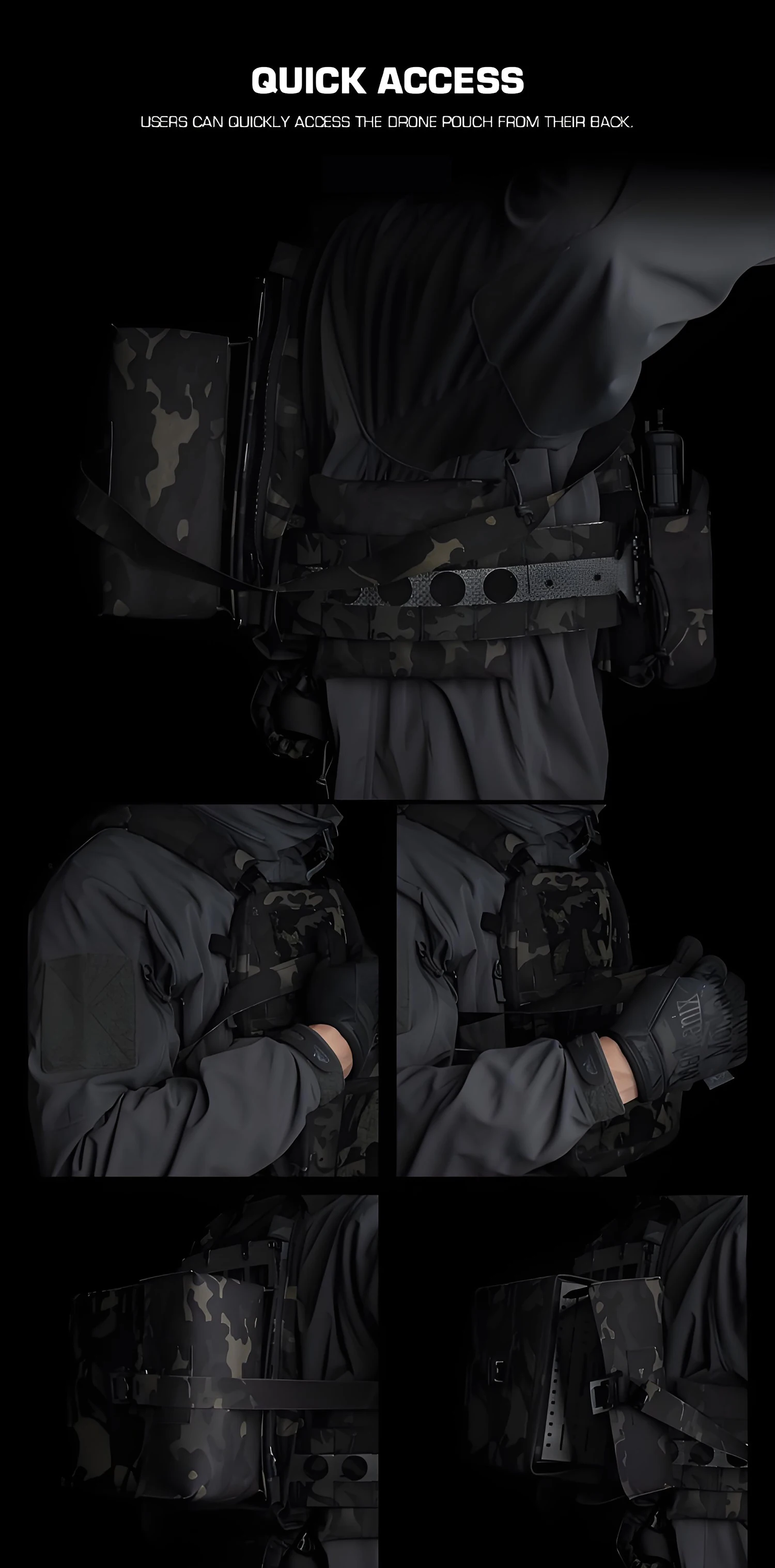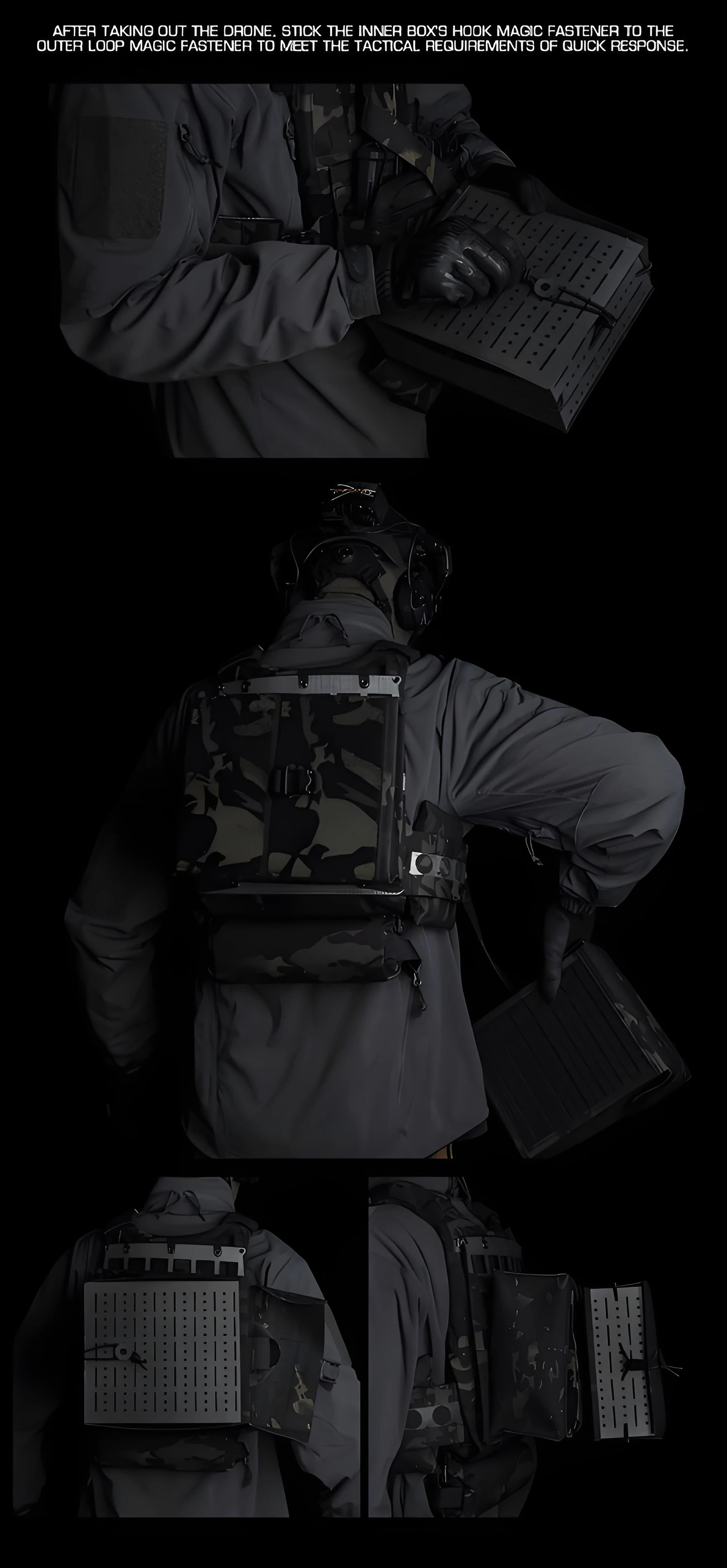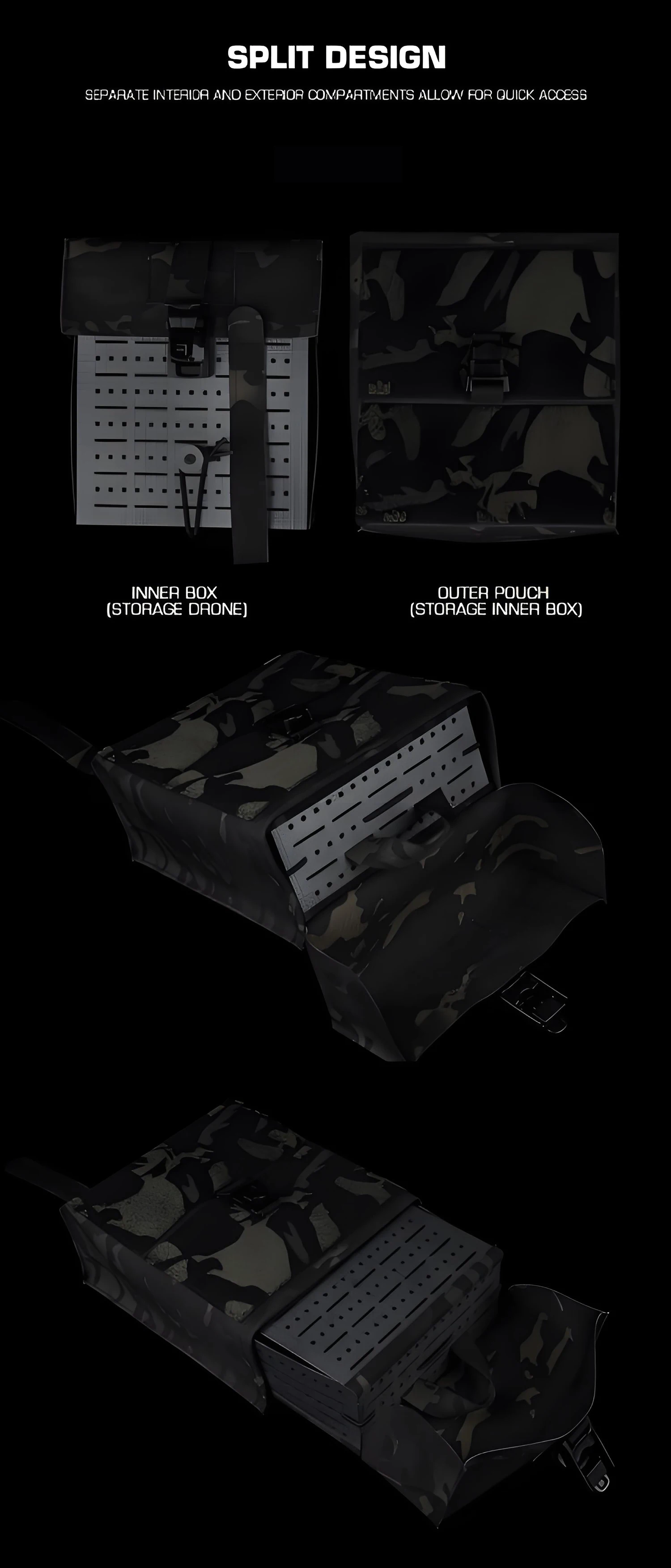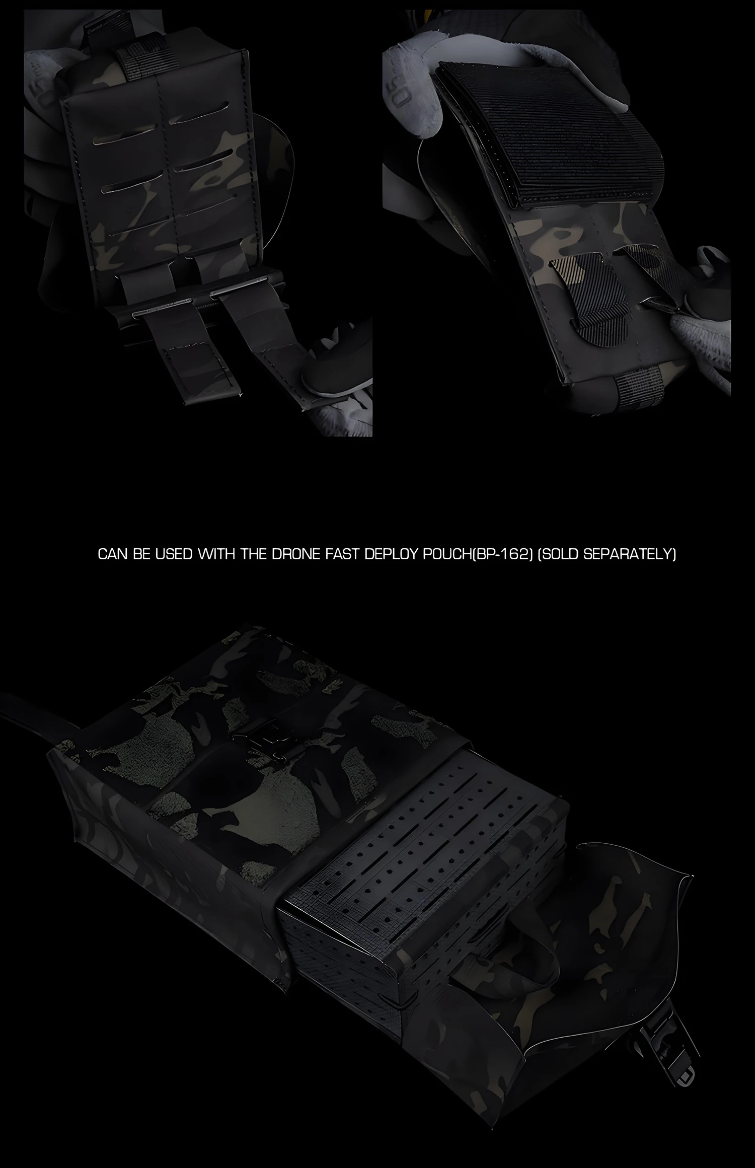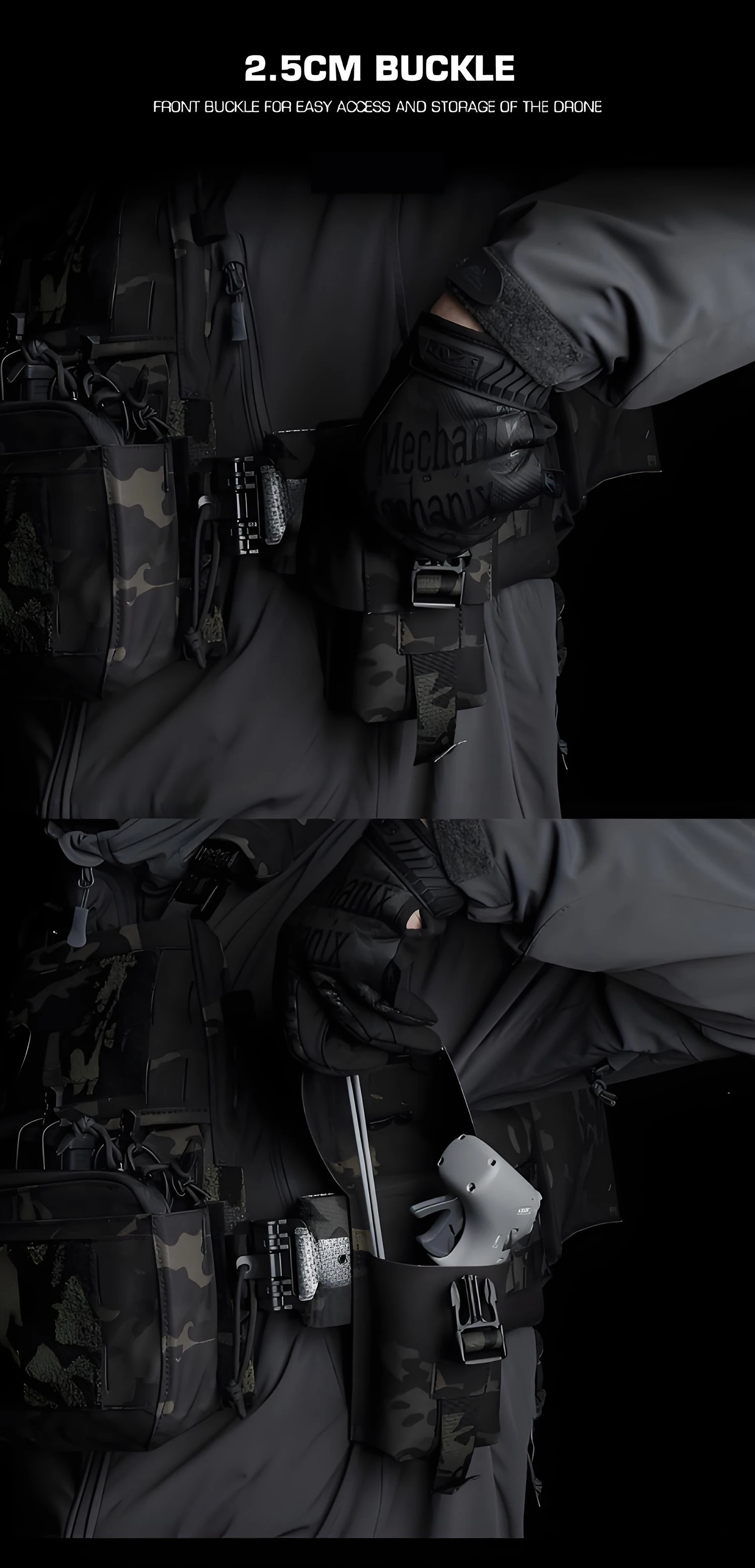 Descripción: Diseñada para una rápida implementación de drones en escenarios tácticos, la bolsa Fast Deploy para drones combina una durabilidad robusta con una organización inteligente.Su interior de diseño dividido cuenta con una caja interior extraíble para un almacenamiento seguro del dron y una bolsa exterior compatible con MOLLE para un acceso instantáneo durante las misiones.Con un peso de solo 0,463 kg (26x22x11 cm), esta bolsa se integra perfectamente con chalecos tácticos, mochilas o cinturones a través del montaje M SISTEMA, mientras que la hebilla de liberación rápida y el sistema de cierre mágico permiten la recuperación con una sola mano en segundos. Diseñada para operadores de drones tácticos y entusiastas del aire libre, la bolsa para controlador de drones ofrece almacenamiento seguro y portátil para DJI, FPV y otros controles remotos de drones.Con compatibilidad con correas MIL-SPEC MOLLE, esta bolsa compacta se fija fácilmente a chalecos tácticos, cinturones o mochilas para una rápida implementación.Su hebilla de liberación rápida de 2,5 cm garantiza un acceso instantáneo a su controlador durante misiones críticas, mientras que la resistente tela de camuflaje 500D resiste el desgaste y la intemperie. Aspectos destacados clave: • Diseño de doble compartimento: la caja interior protege los drones (por ejemplo, los modelos DJI Mavic/FPV), mientras que la bolsa exterior se monta mediante correas MOLLE/PALS. • Acceso rápido táctico: recupere los drones directamente de su mochila sin quitar equipo, ideal para airsoft, ejercicios militares o operaciones de emergencia. • Cuerda elástica y sujetadores mágicos: asegure las baterías y los controladores firmemente; Las capas interiores de gancho/bucle bloquean los componentes durante el movimiento. • Tela de camuflaje 500D: el material de grado militar resiste la abrasión, el agua y los daños causados por los rayos UV. • Transporte multiángulo: Opciones de montaje vertical/horizontal con correas reforzadas y anillos en D. • Ajuste exclusivo: el compartimento diseñado a medida sostiene cómodamente la mayoría de los controladores de drones estándar. • Soporte M SISTEMA: Se integra perfectamente con el equipo táctico equipado con correas MOLLE/PALS. • Ligero y compacto: pesa sólo 0,06 kg (16x9x5 cm), minimizando el volumen durante las operaciones. • Acceso con hebilla frontal: recupere o guarde su controlador en segundos con una sola mano. • Transporte multiángulo: úselo vertical u horizontalmente mediante correas ajustables para un montaje versátil.