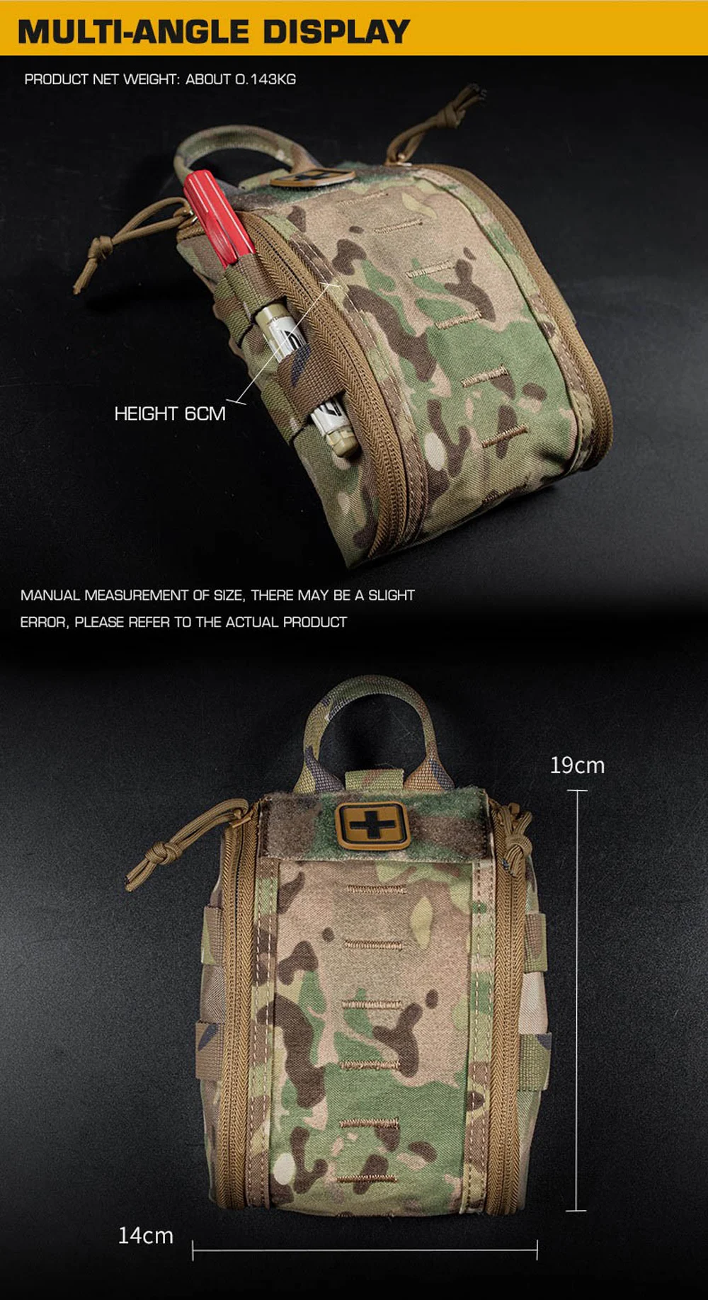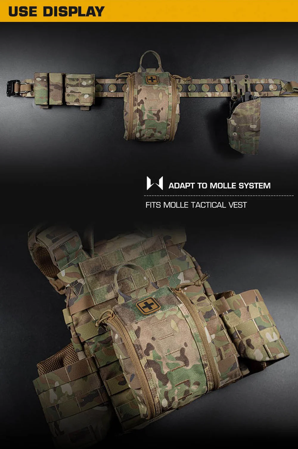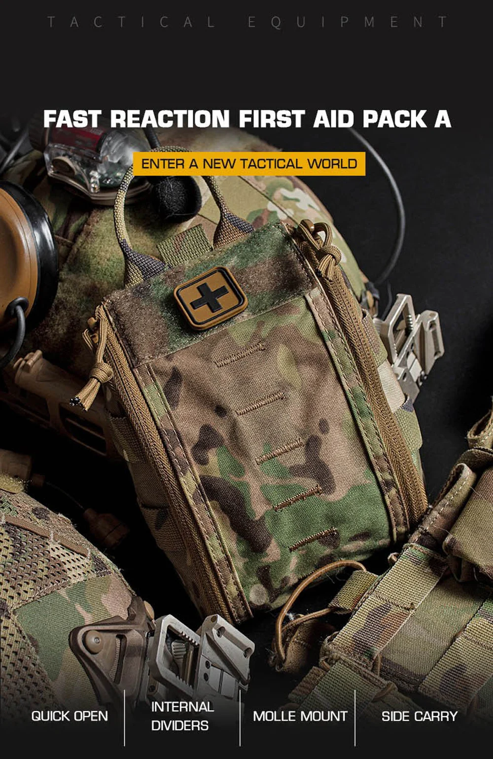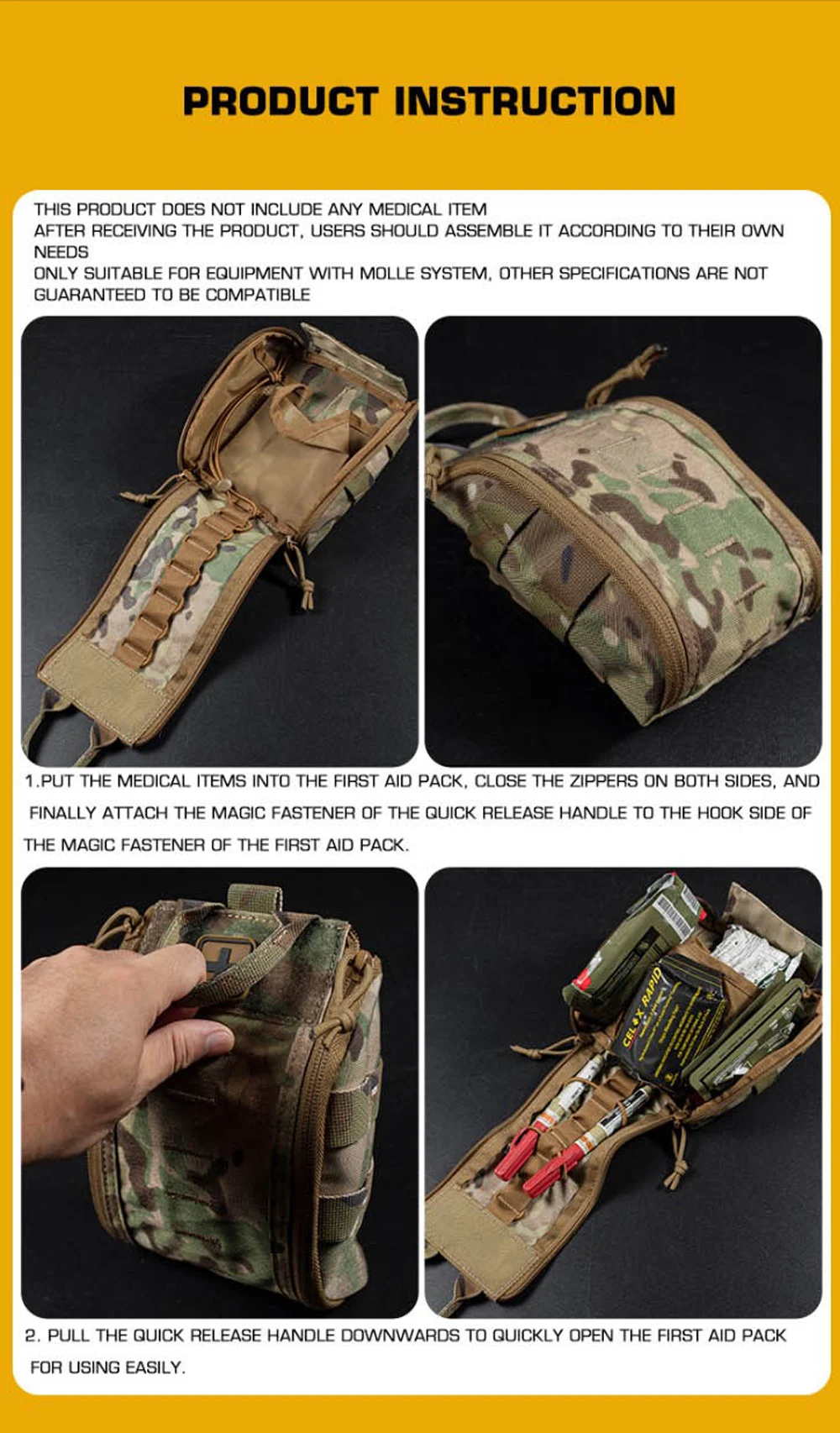 Nombre del producto: Paquete de primeros auxilios de liberación rápida A Número de artículo.:BP-85 Tamaño del producto: 27*16*3CM Peso neto del producto: 0,143 kg. Peso bruto del producto: 0,158 KG Color del producto: negro mate/gris lobo/verde Ranger/marrón coyote/MC/MCBK Material principal: tela Cordura, cremallera YKK. Escena aplicable: deportes al aire libre, juegos tácticos de airsoft, etc.