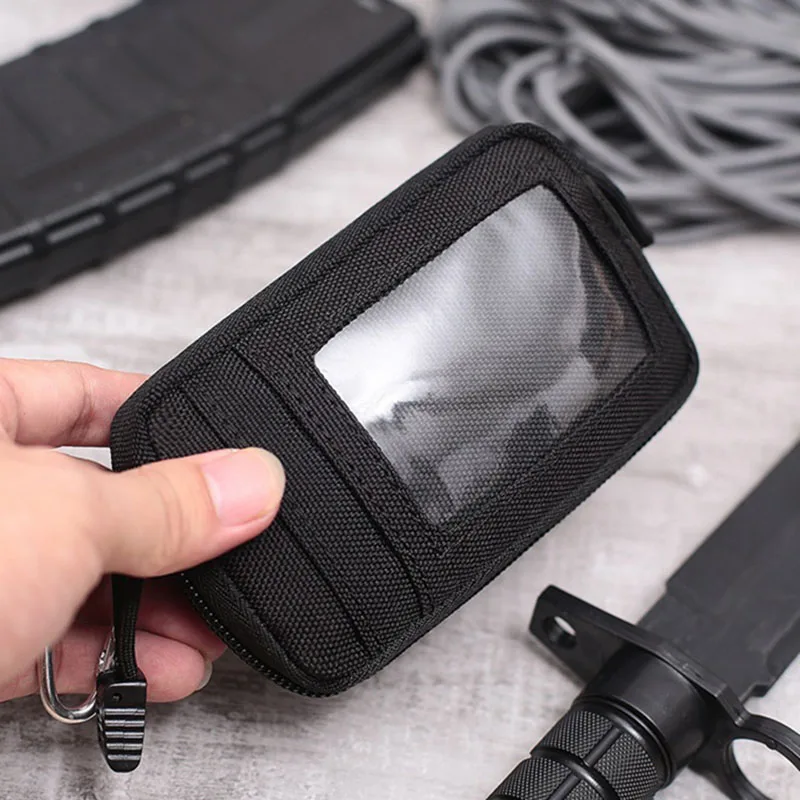Bolsa pequeña y de perfil bajo que mide 1" de espesor para guardar tarjetas, dinero, monedas y llaves.