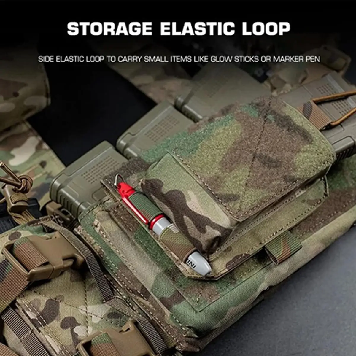 【Bucle elástico de almacenamiento】Lazo elástico lateral para llevar artículos pequeños como palos luminosos o rotuladores.