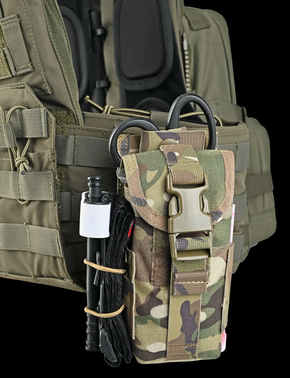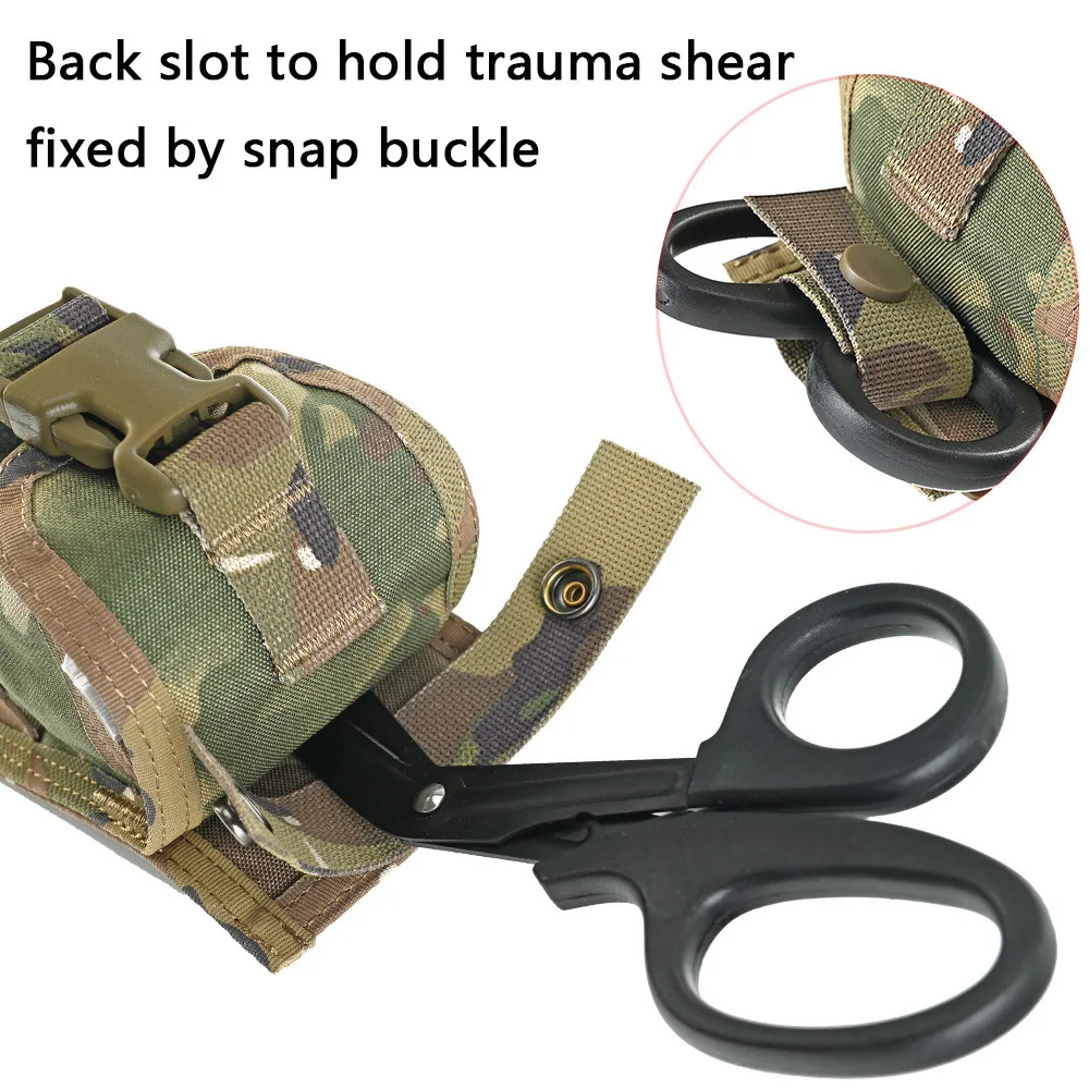 The IFAK pouch consits of 1 main department and 1 admin department. Quick-pull interior strap of molle first aid pouch aids in one handed removal of trauma kits. And the top of admin department is built in a webbing strap with snap buckle to hold you trauma shear